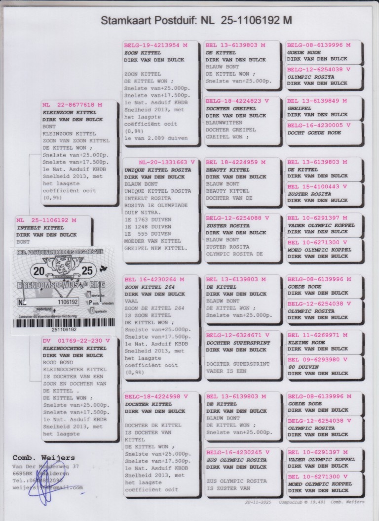 Uit: ”Kleinzoon Kittel”, uit zoon & kld. ”Kittel”, 1. Nat. Asduif Sprint KBDB & zoon ”Olympic Rosita”, 1. Olympiade duif Cat. Sprint x ”Kleindochter Kittel”, uit zoon & dochter ”Kittel”, 1. Nat. Asduif Sprint KBDB