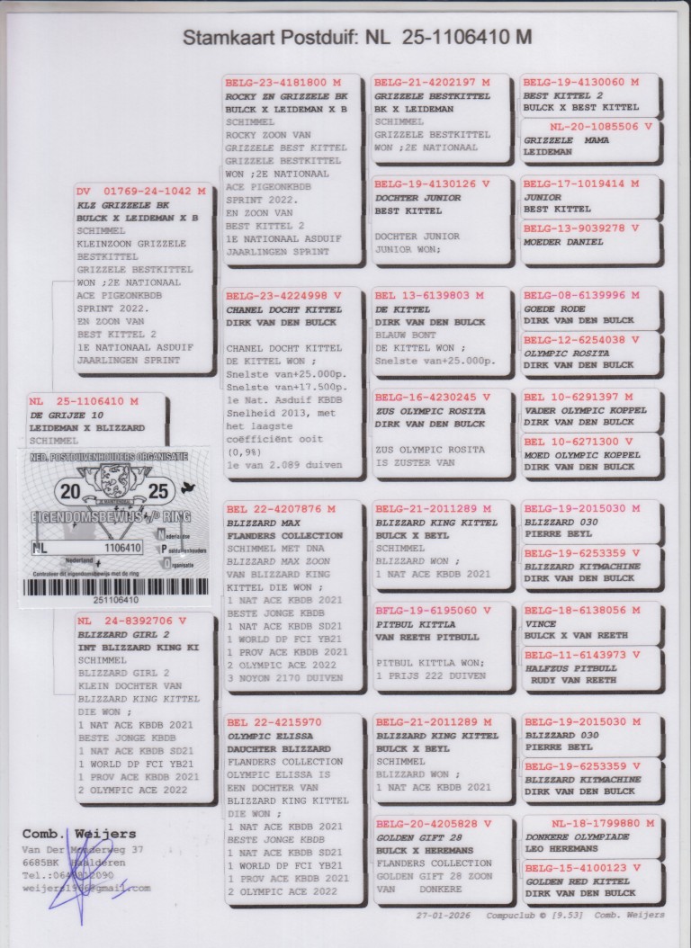 Uit: ”Klz. Grizzle BK”, uit zoon ”Grizzle Best Kittel”, uit dochter ”Kittel” x ”Blizzard Girl 2”, uit zoon & dochter ”Blizzard King Kittel”, 1. Nat. Asduif Sprint KBDB & vader ”Unicum”, 1. Nat. Asduif Srint KBDB 2025