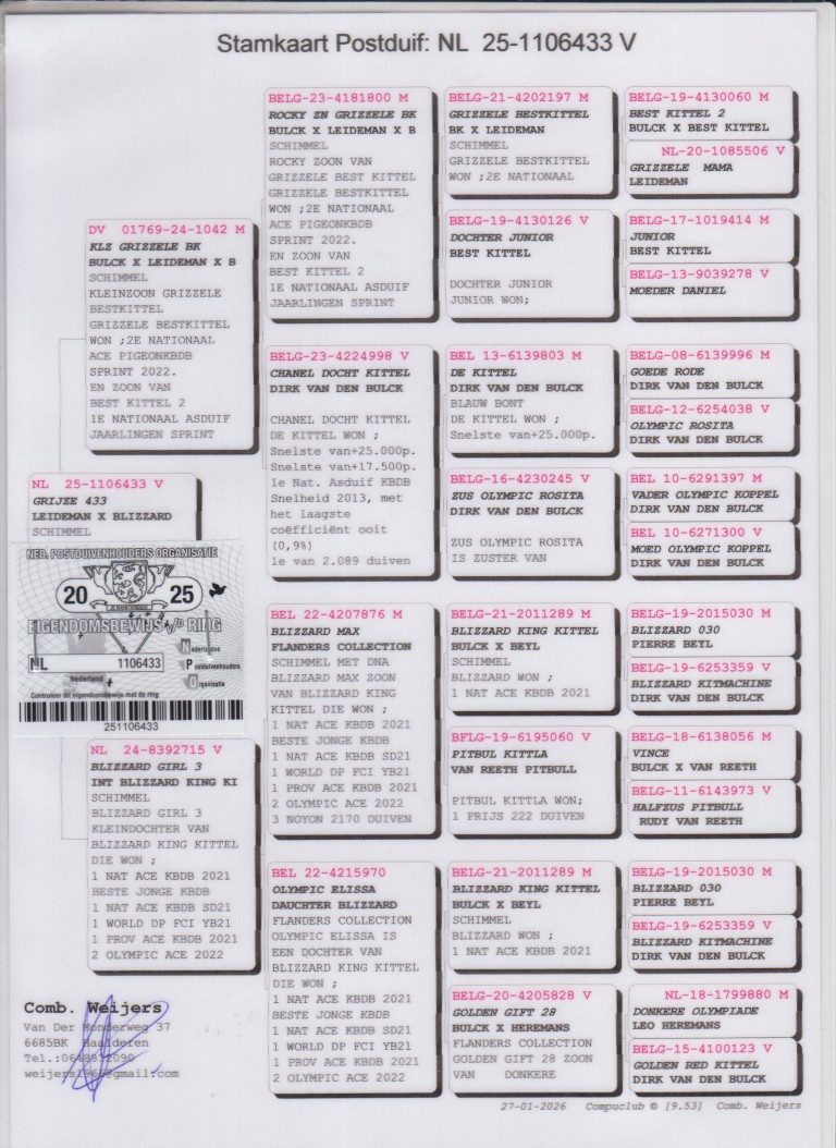 Uit: ”Klz. Grizzle BK”, uit zoon ”Grizzle Best Kittel”, uit dochter ”Kittel” x ”Blizzard Girl 3”, uit zoon & dochter ”Blizzard King Kittel”, 1. Nat. Asduif Sprint KBDB & vader ”Unicum”, 1. Nat. Asduif Srint KBDB 2025