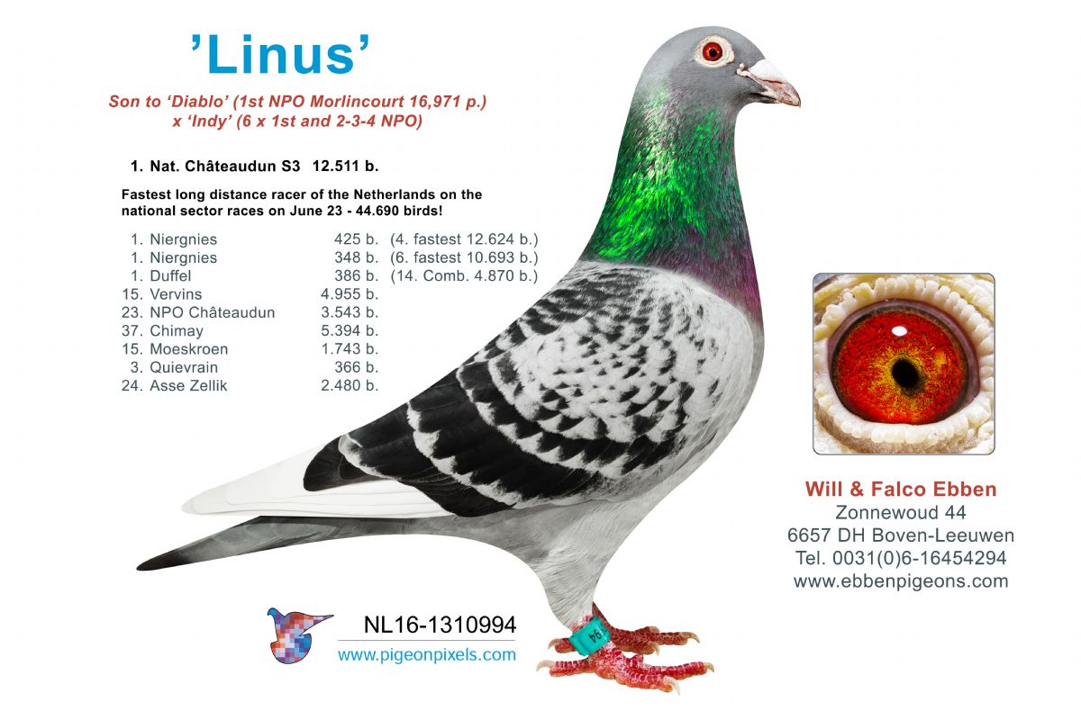 “Mable” is een volle zus van “Linus”, stamduif van het hok en winnaar van 1e Nationaal Châteaudun tegen 12.511 duiven.