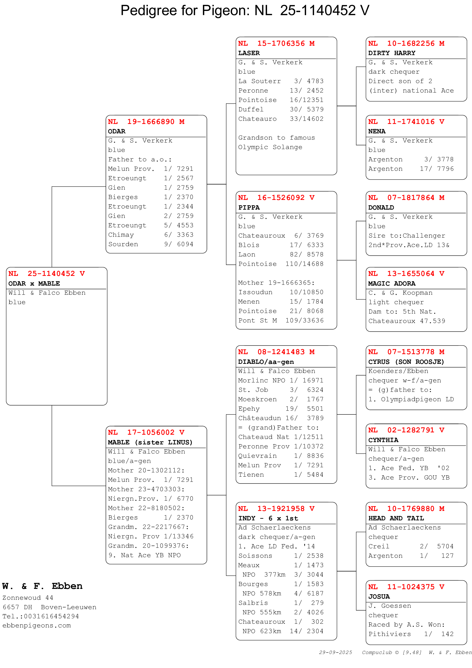 “Odar” is een zoon van NL15-1706356 “Laser” (kleinzoon van “Olympic Solange”), met onder andere 3e NPO La Souterraine tegen 4.783 duiven, gekoppeld aan NL16-1526092 “Pippa”, met onder andere 6e NPO Châteauroux tegen 3.769 duiven.