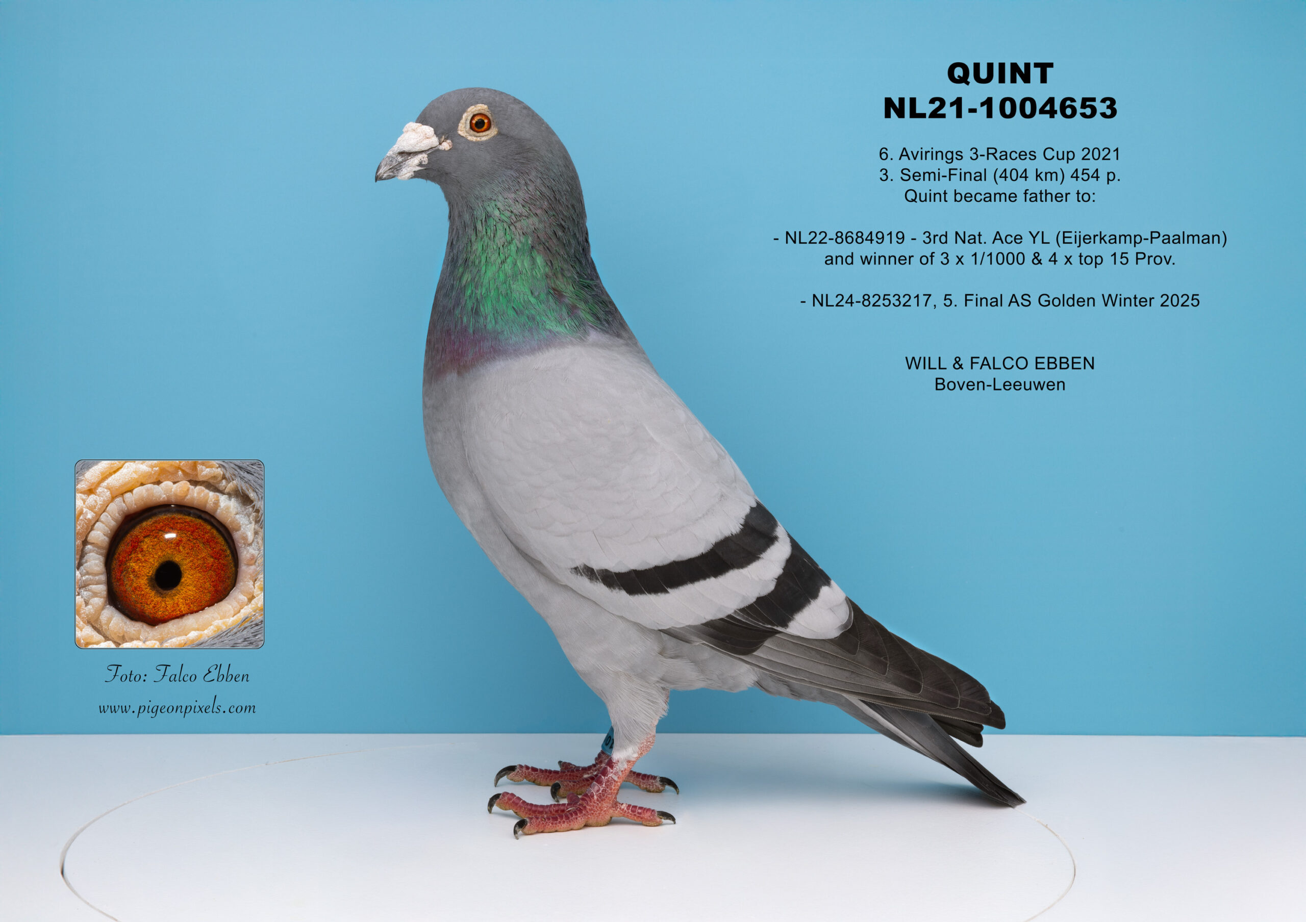 Quint komt uit NL20-1302160 “Patser”, een zoon van het topkoppel “Odar” x “Mable”, gekoppeld aan NL20-1302162 “Princess” (1e Asduif Vitesse Jong Rivierenland 2020) uit “Kurt” x “Evolution”.