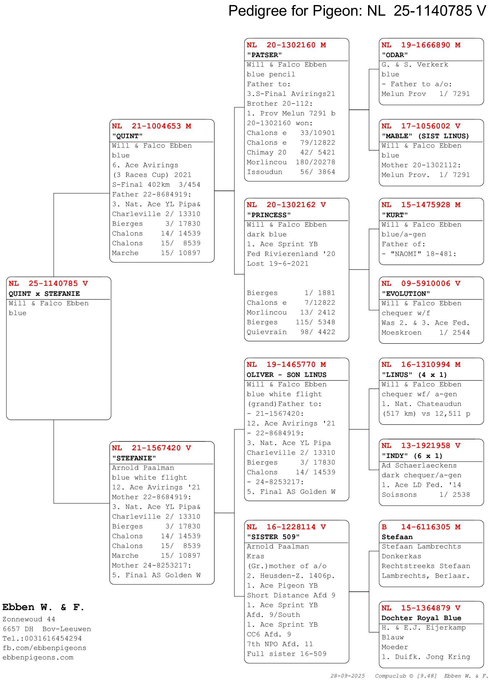Stefanie komt uit NL19-1465770 “Oliver” (rechtstreeks W. & F. Ebben) uit stamduif “Linus” gekoppeld aan zijn eigen moeder “Indy”, gekoppeld aan NL16-1228114 Zus “509”, een topkweekster en moeder van diverse duifkampioenen in groot verband.
