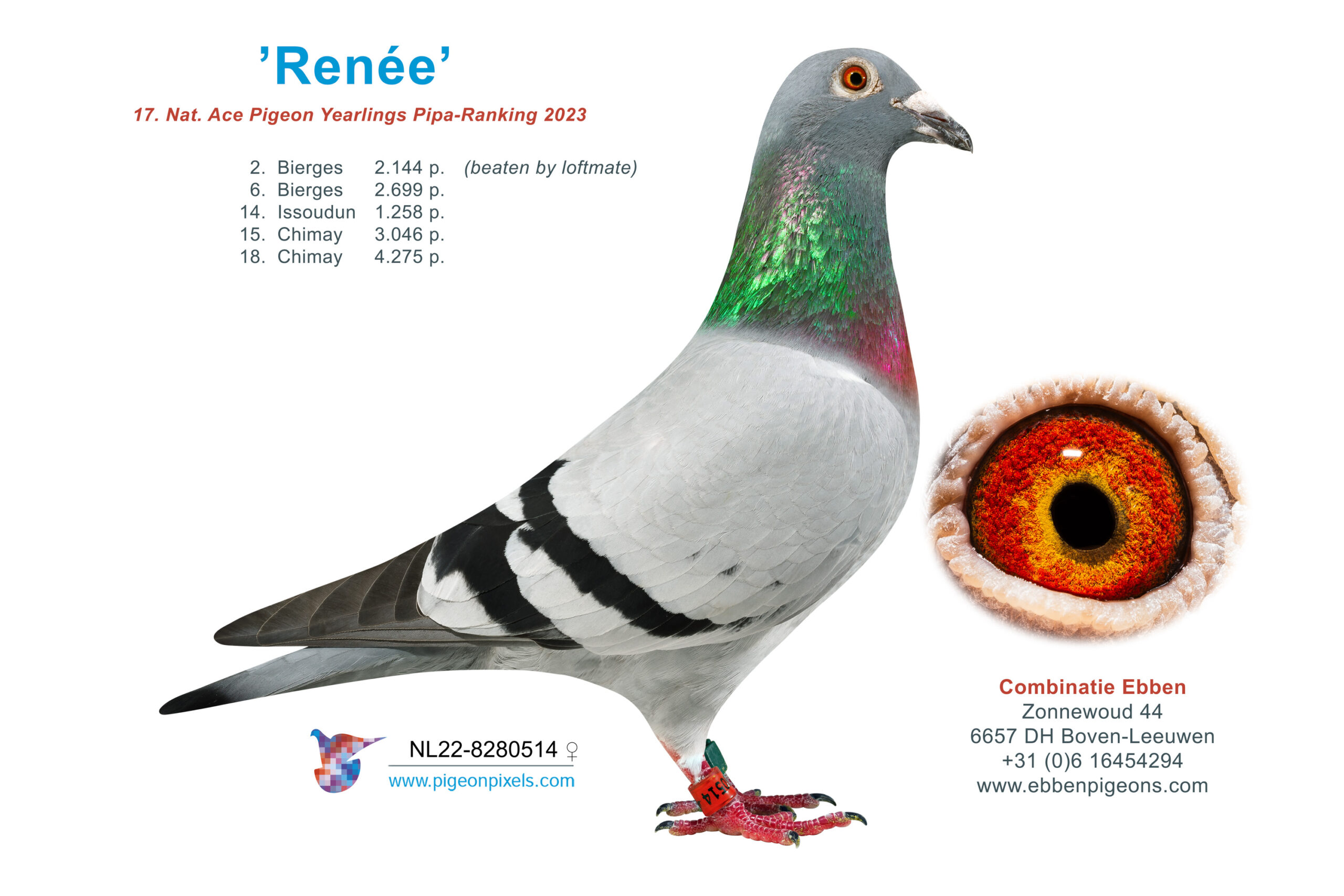 “Renée” is een dochter van “Linus” x “Katja” en daarmee een volle zus van o.a. “Pizza”, “Pandemic”, “Tornado” en “Tsunami”. Zij werd reeds als jaarling naar de kweek verhuisd vanwege haar uitzonderlijke prestaties en afstamming.