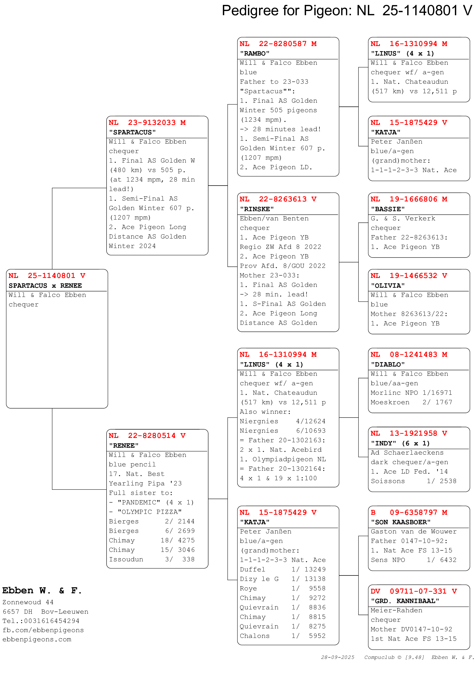 Uit: ”SPARTACUS”, 1. Finale OLR As Golden Winter Race, 1. Halve Finale OLR As Golden Winter Race x ”RENEE”, 17. Nat. Asduif Jaarlingen, 2.-2.144 d., 3.-338 d., 6.-2.699 d., zus ”Olympic Pizza”, 1. Olympiade Cat. Midfond & “Pandemic”, 5. & 8. Nat. Asduif.