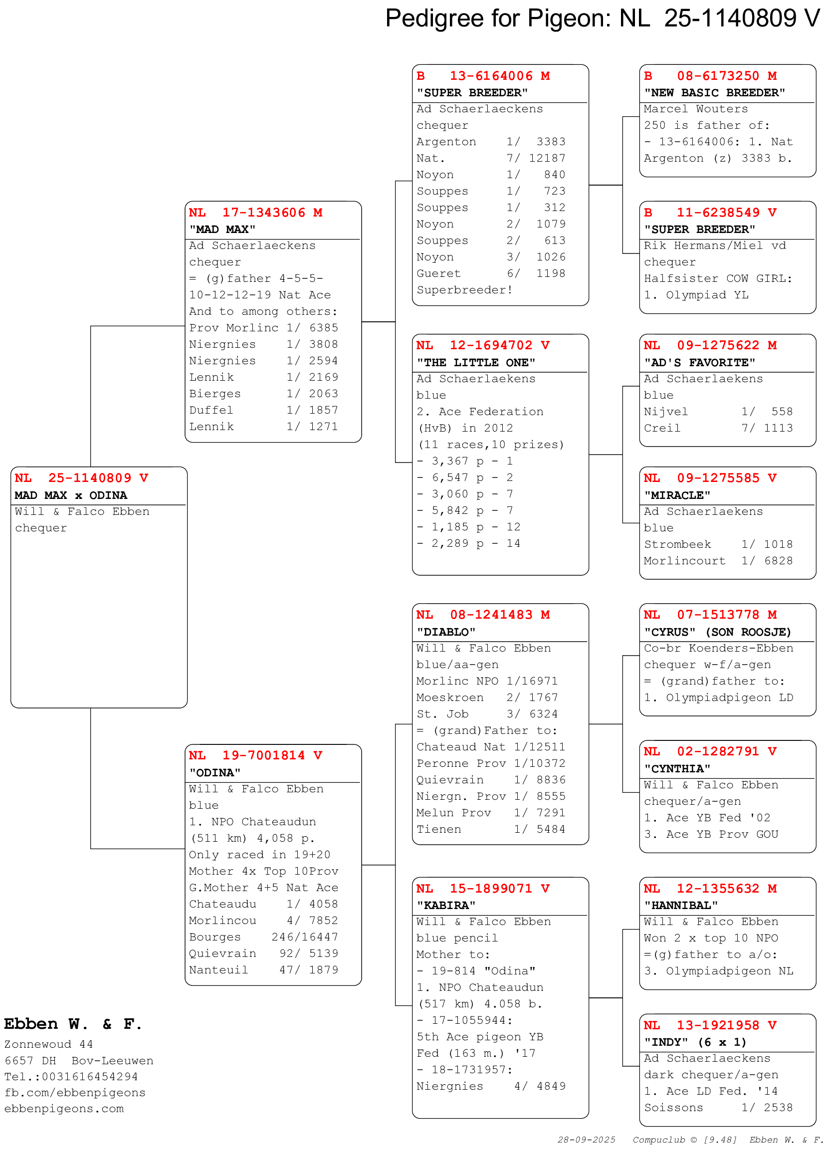 Uit: ”MAD MAX”, vader & gr-vader 4.-5.-5.-10.-12.-12.-19. Nat. Asd., 1. Prov. 6.385 d., 1.-3.808 d., 1.-2.954 d., 1.-2.169 d., 1.-2.063 d., 1.-1.857 d., etc. x ”ODINA”, 1. NPO Chateaudun 4.058 d., moeder 4x top 10 Prov & gr.moeder “Super 33”, 4. & 5. Nat. Asduif!!!