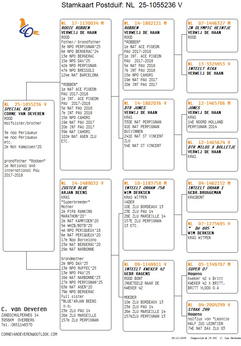 Uit: ”Rooie Robben”, vader & gr-vader 3. NPO Perpignan, 6. NPO Bergerac, zoon ”Robben”, 1. Int. Asduif Pau x ”Zuster Blue”, moeder 2. Nat. Asduif Marathon, , 4. NPO Perigueux, 5. Nat. Asduif WHZB, gr-moeder 2. NPO Dax