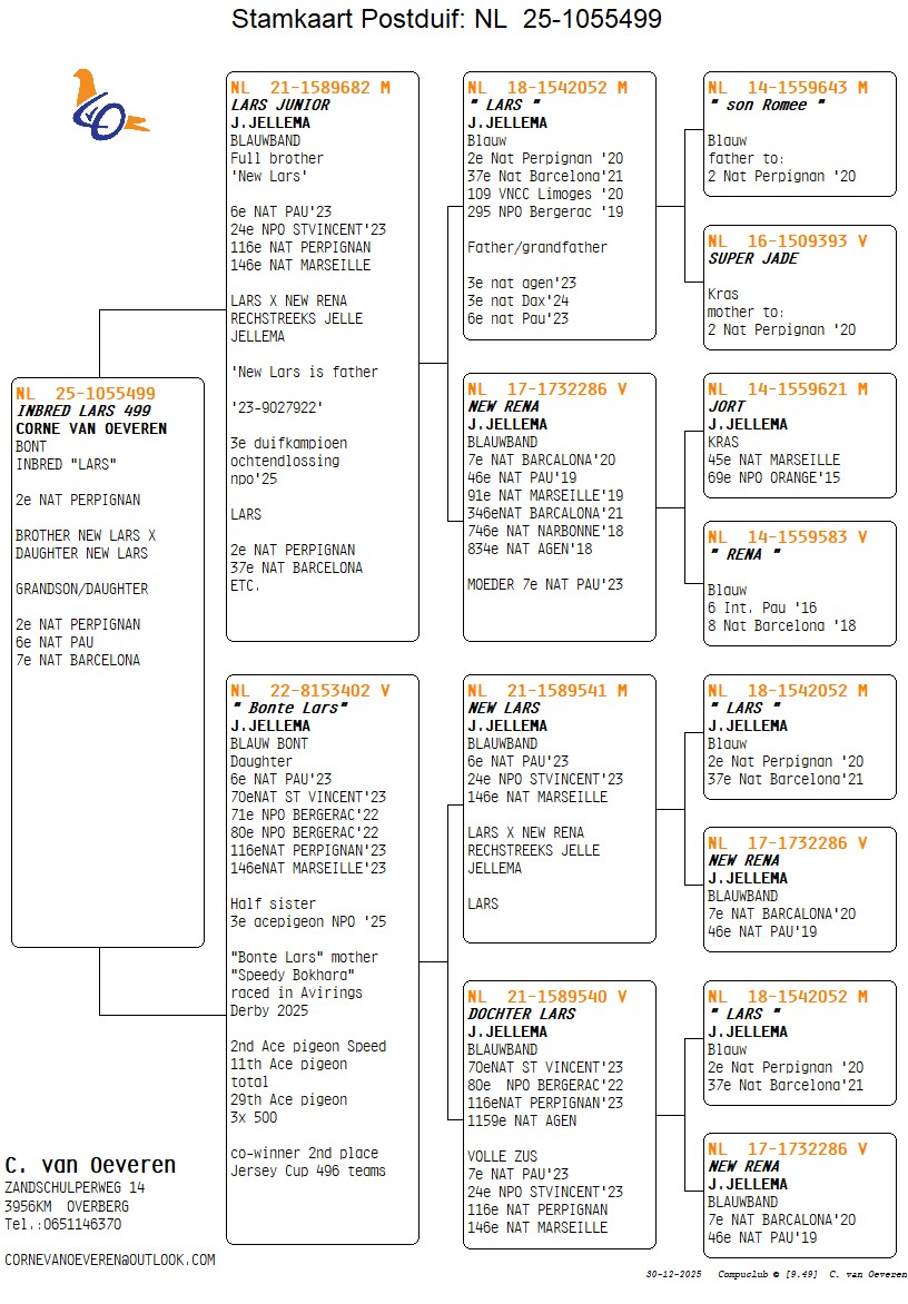 Uit: ”Lars Junior”, zoon ”Lars”, 2. Nat. Perpignan, 37. Nat. Barcelona, zoon ”New Rena”, 7. Nat. Barcelona x ”Bonte Lars”, moeder 2. Asduif Sprint OLR Avirings, 11. Asduif OLR Avirings, dochter ”New Lars”, 6. Nat. Pau