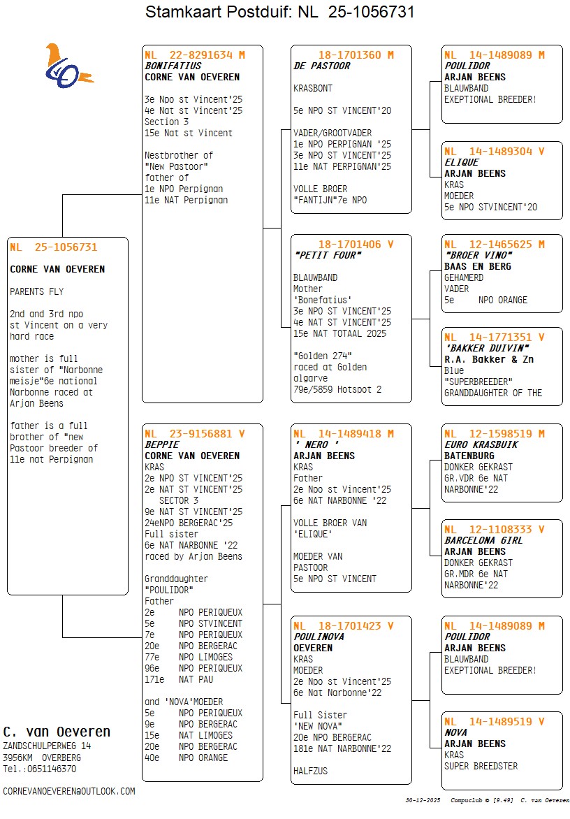 Uit: ”Bonifatius”, 3. NPO St.Vincent, 4. Nat. Sector St.Vincent, 15. Nat. St.Vincent, nestbroer 1. NPO Perpignan x ”Beppie”, 2. NPO St.Vincent, 2. Nat. Sector St.Vincent, 9. Nat. St.Vincent, 24. NPO Bergerac, 100% Arjan Beens