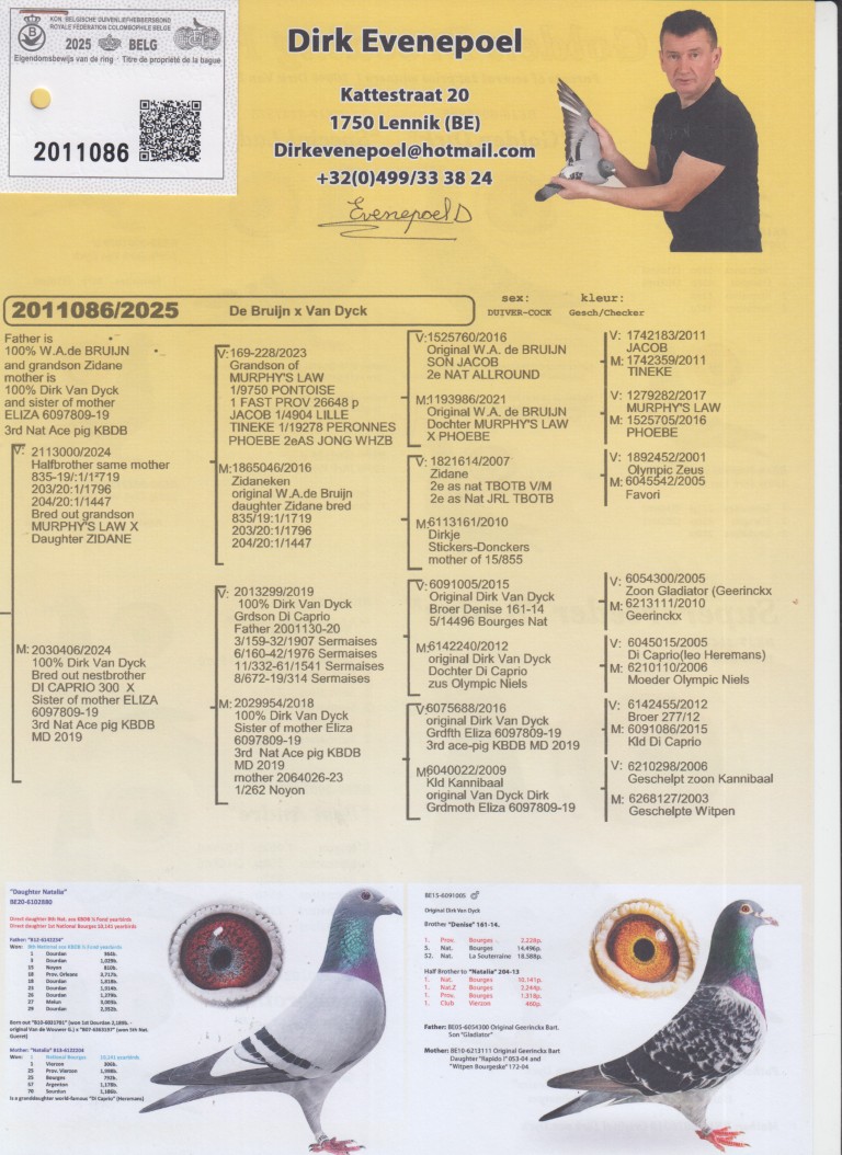 Uit ”Murphy’s Law 000”, 1/2 broer 1.-1.719 d., 1.-1.796 d., 1.-1.447 d., uit klz. ”Murphy’s Law”, 2x 1. Nat. Asduif x ”100% Dirk van Dyck”, uit klz. ”Di Caprio”, Dirk van Dyck, vader ”Olympic Niels”, Olympiade duif & Superkweker