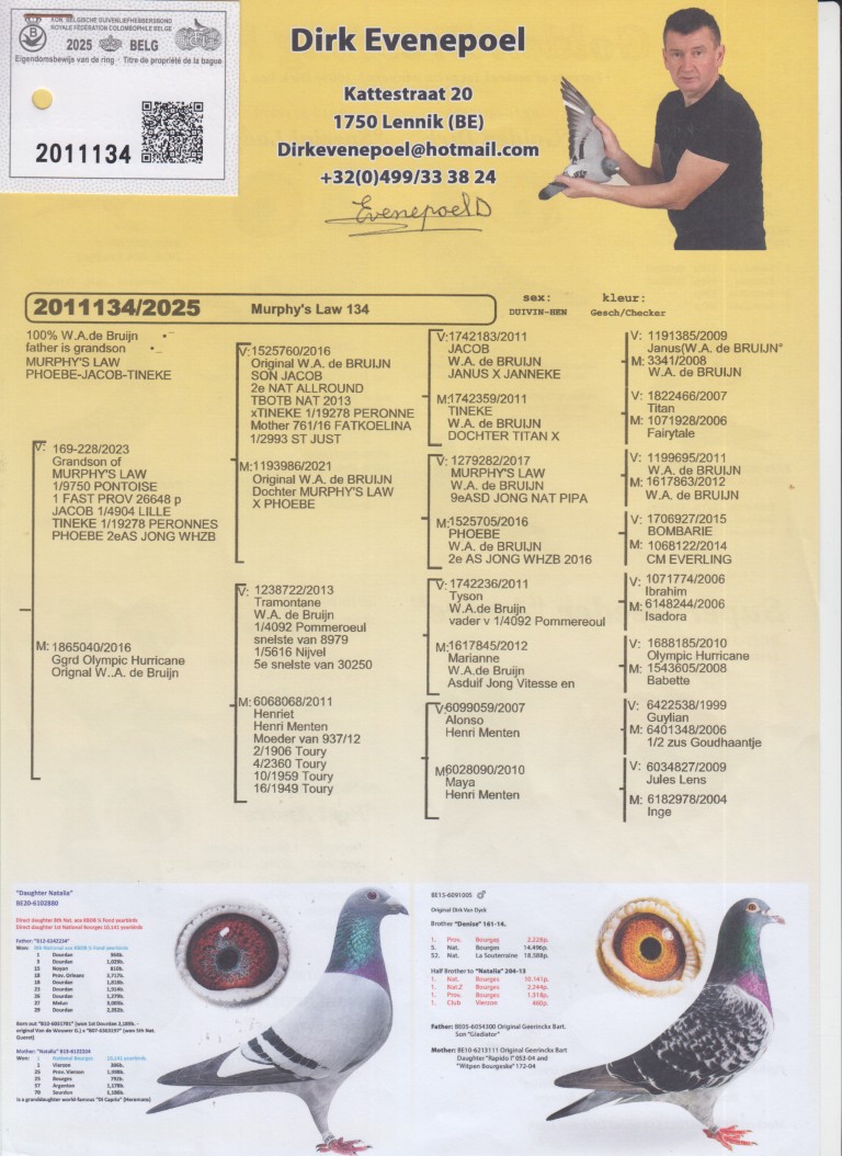 Uit: ”Grs. Murphy’s Law”, 1. Prov. Pontoise 26.648 d., uit dtr. ”Murphy’s Law”, 2x 1. Nat. Asduif, nazaten winnen: 7x 1. Nat. Asduif x ”Ggrdtr. Olympic Hurricane”, 1/2 zus 2.-1.906 d., 4.-2.360 d., lijn ”Olympic Hurricane”