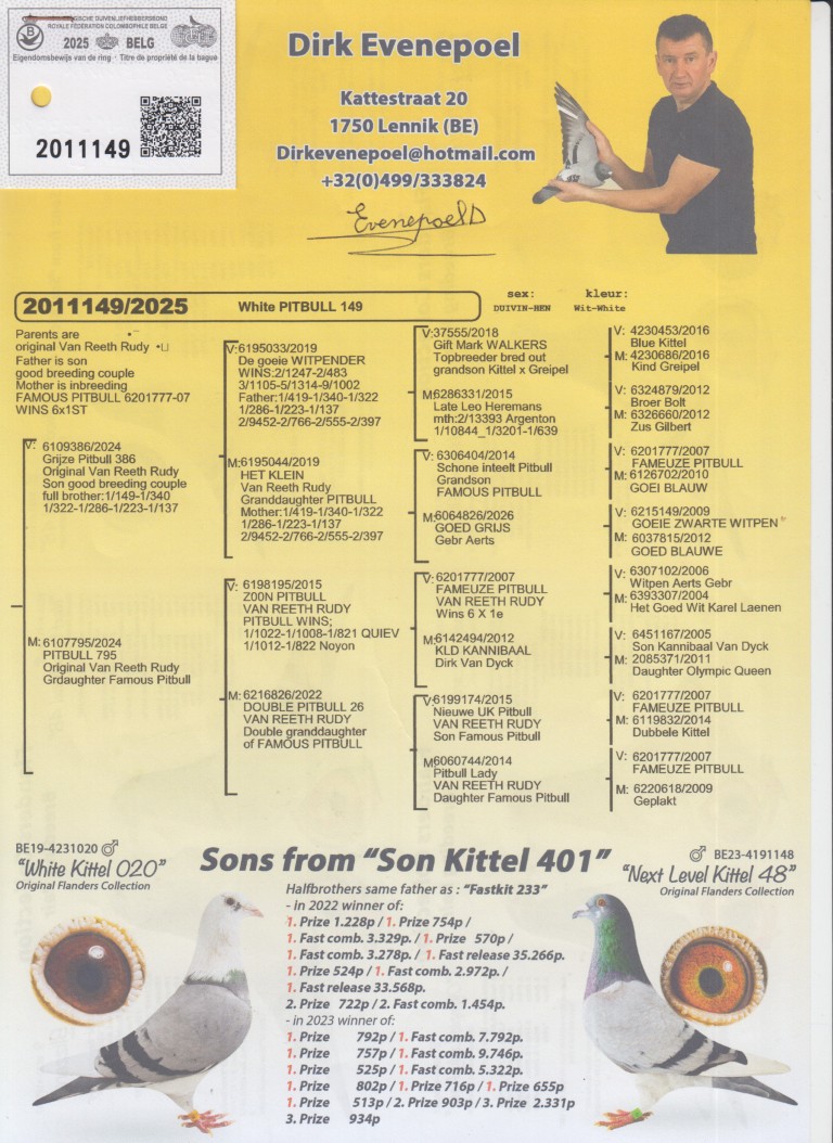Uit: ”Grijze Pitbull 386”, broer 6x 1. Prijs, uit kld. ”Pitbull”, lijn ”Kittel” & ”Greipel” x ”Pitbull 795”, ut zoon ”Pitbull”, uit dubbele kld. ”Pitbull”, legendarische vlieger & kweker, nazaten winnen 6x 1. Nat. Asduif