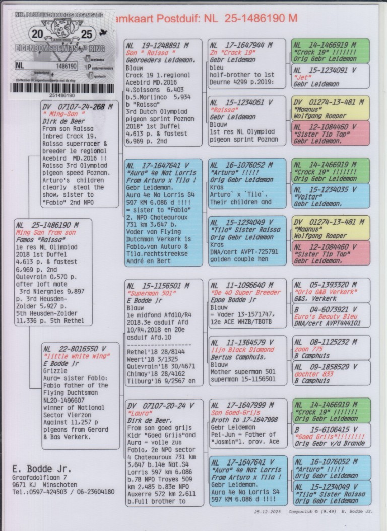 Uit: ”Ming-Son”, zoon ”Aura”, 4. Nat. Lorris 6.086 d. & dochter ”Arturo” & ”Tila”, Stamkoppel Gebr. Leideman, ouders ”Cobalt”, ”Fabio”, ”Talent”, etc. x ”Little White Wing”, uit kld. ”Crack 19” & ”Goed Grijs”, 7x 1. Prijs