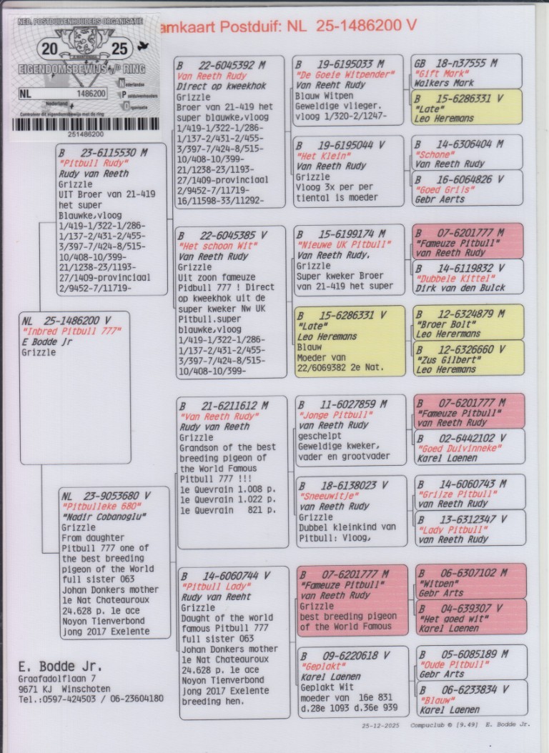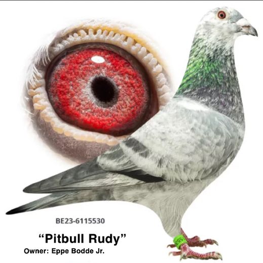 Uit: ”Pitbull Rudy”, uit kld. ”Pitbull” x ”Pitbulleke 680”, inteelt ”Pitbull”, nazaten winnen: 1.-1.-1.-1.-2.-2.-2.-2.-3.-3.-3.-3.-4. Nat. Asduif & Olympiade duif, ”Pitbull”, zelf 6x 1. Prijs winnaar!