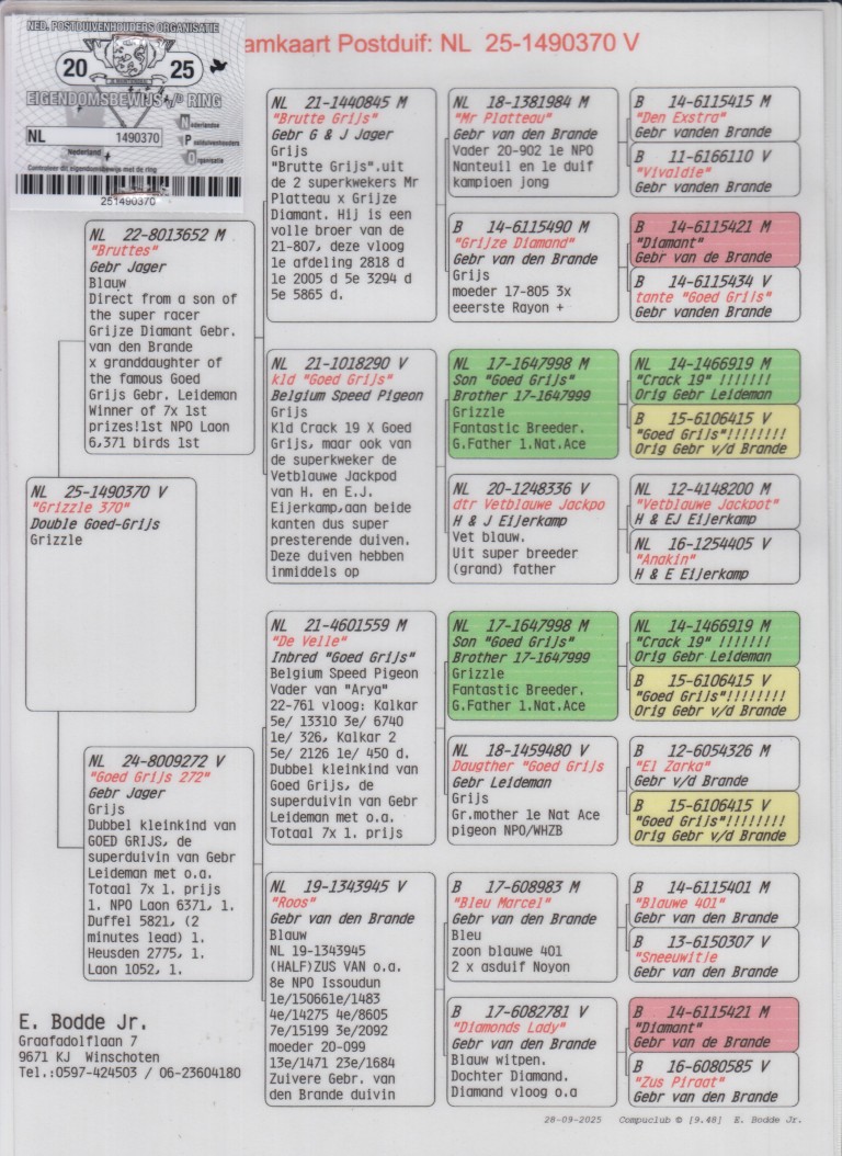 Uit: “Bruttes”, zoon “Brutte Grijs”, 1/2 broer 3x 1. & kl.d. “Crack 19 & Goed Grijs” x “Goed Grijs 272”, dochter “De Velle”, top kweker, uit zoon & dochter “Goed Grijs” & “Roos”, 1/2 sister 1.-15.661d, 4.-14.275d., 4.-8.605d., uit “Blue Marcel & Diamonds Lady”.