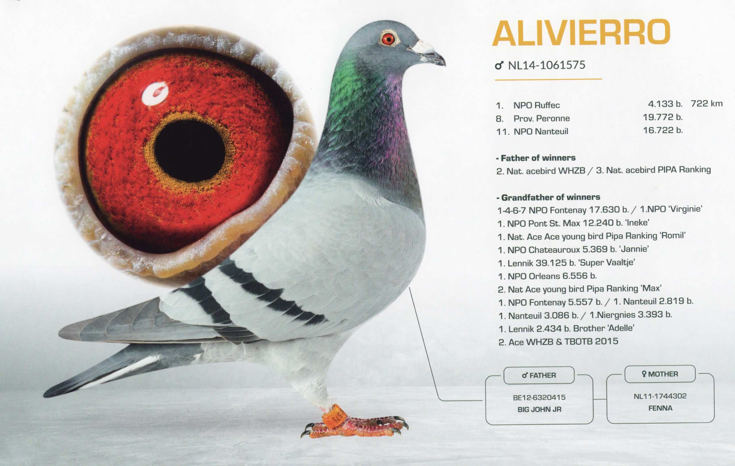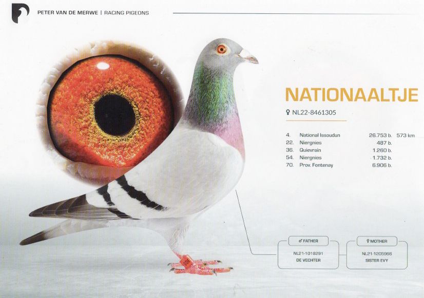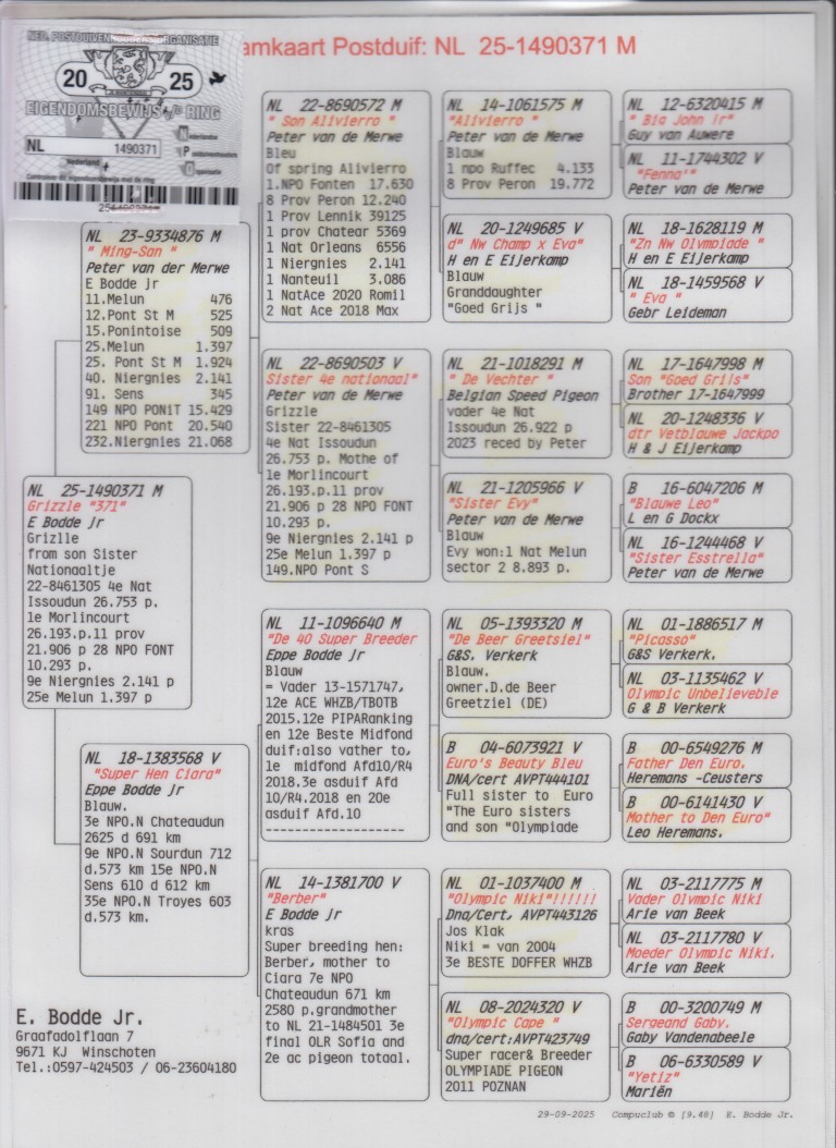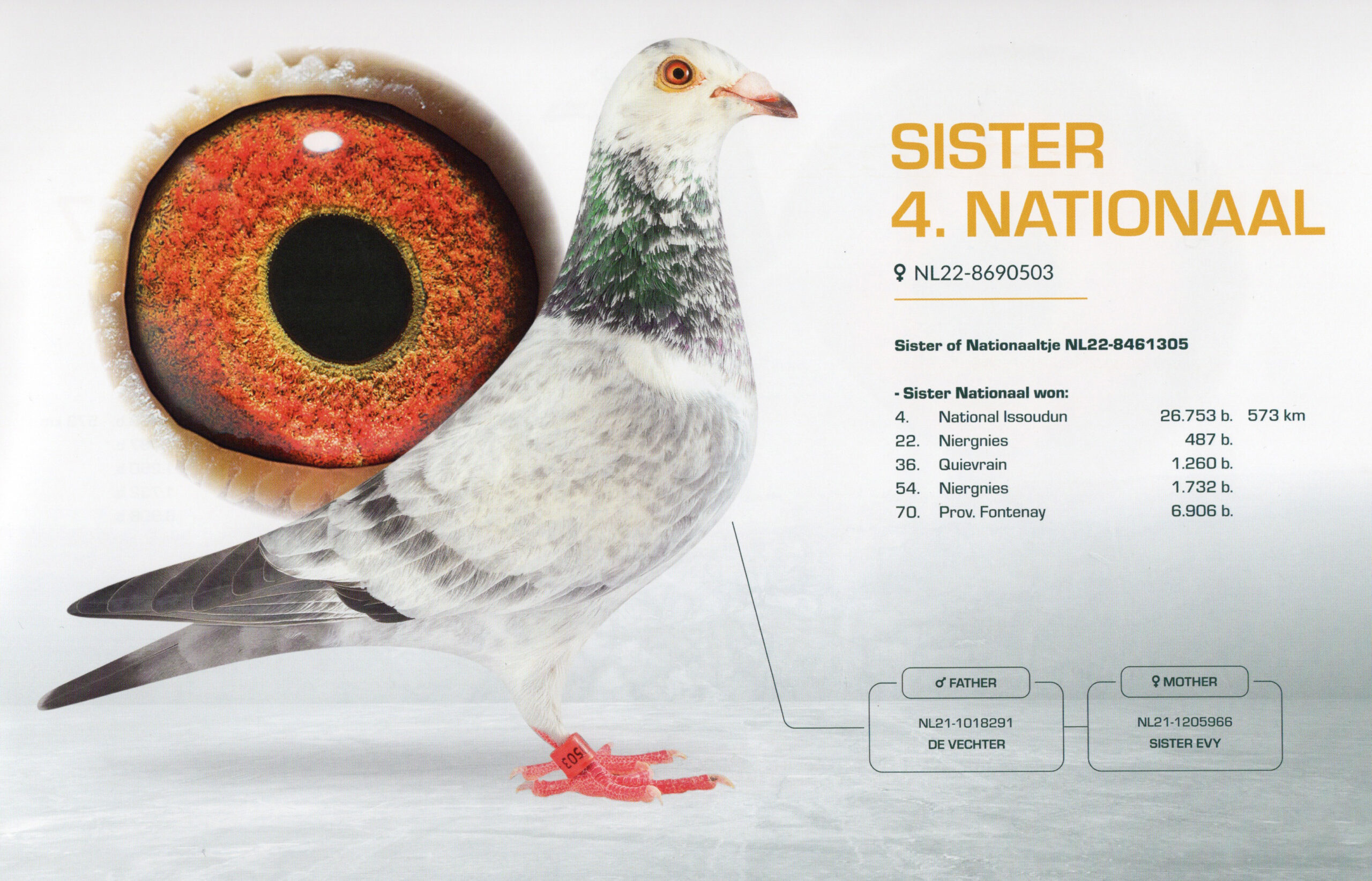 Uit: “Ming-San”, top vlieger, uit “Son Alivierro”, 1. NPO Ruffec 4.133d. & “Sister 4. Nationaal”, Issoudun 26.753d., P. v.d. Merwe x “Super Hen Ciara”, 3. NPO Chateaudun 2.625d., 9. NPO Sourdun, 15. NPO Sens, uit “De Super 40 & Berber”.