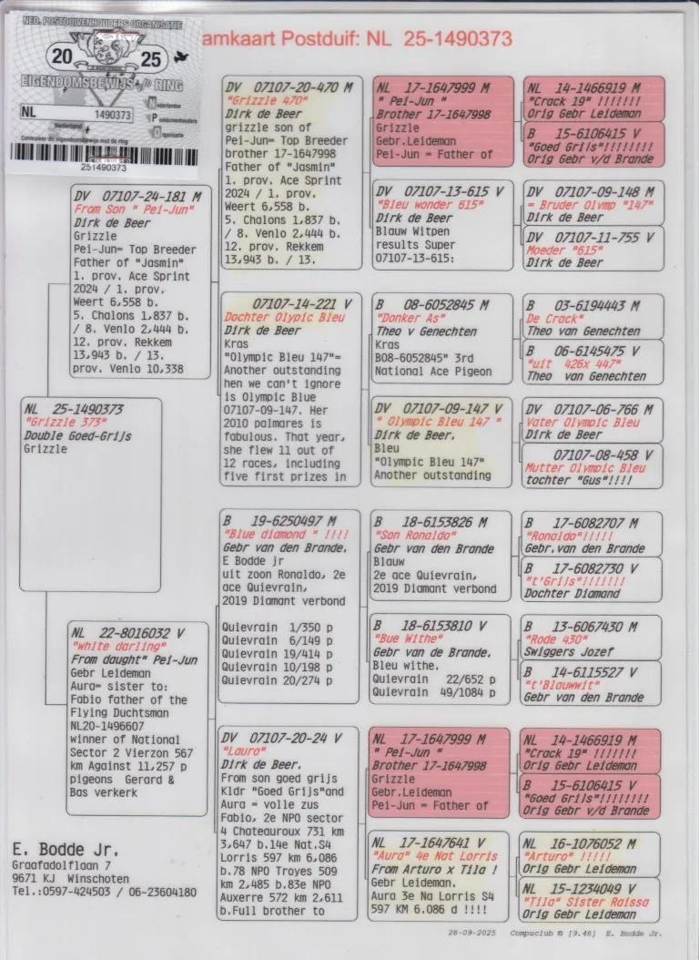 Uit: “The 181”, zoon “Grizzle 470”, uit “Pei-Jun”, top kweker, zoon “Crack 19 & Goed Grijs” & dochter “Olympic Bleu 147”, Dirk de Beer x “White Darling”, dochter “Blue Diamond” & “Laura”, kl.dochter “Crack 19”, “Goed Grijs”, “Autro”, “Tila”.