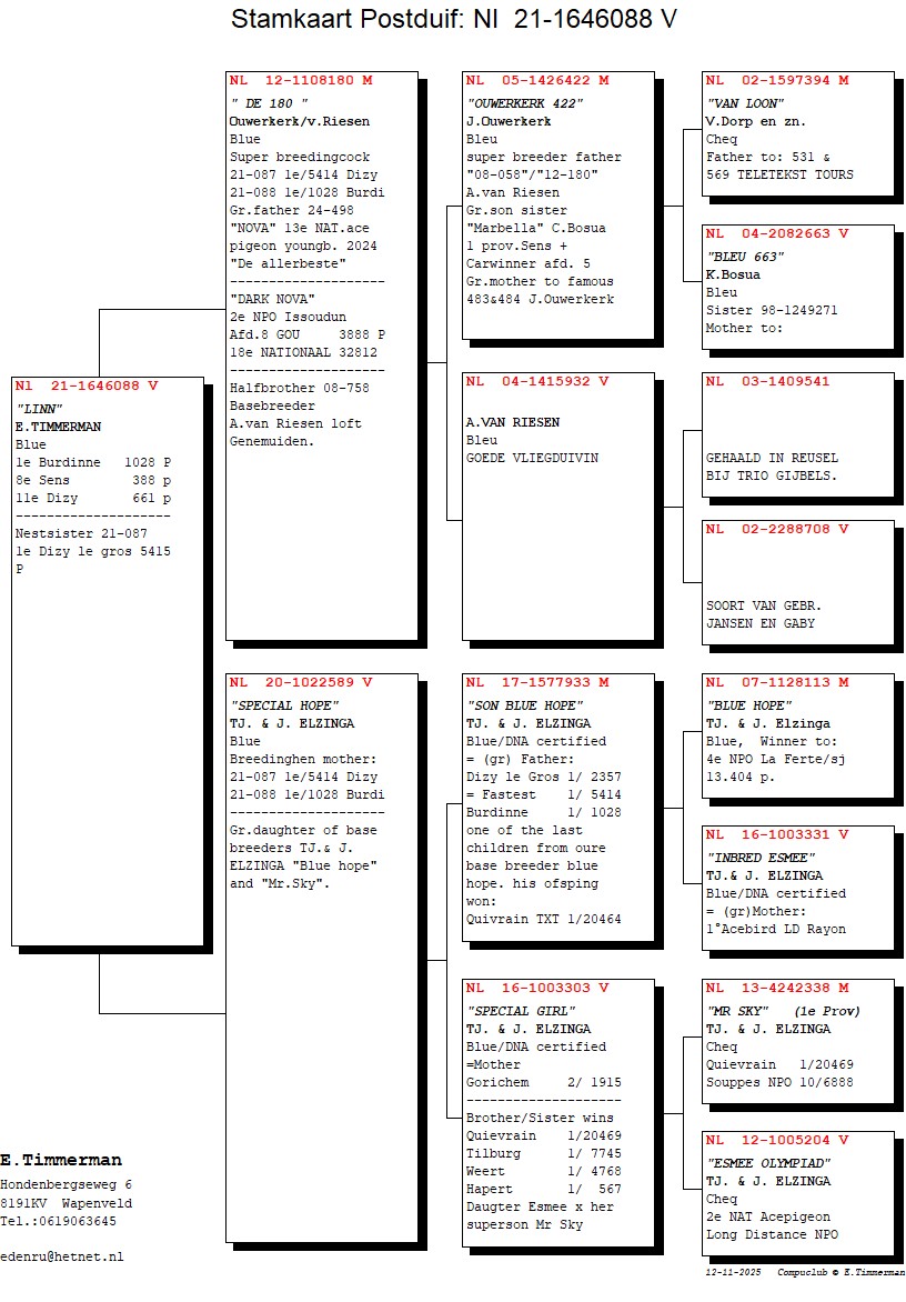 Uit: ”De 180”, vader 1.-5.414 d., gr-vader 13. Nat. Asduif Jonge Duiven, 50% Jan Ouwerkerk x ”Special Hope”, moeder 1.-5.414 d., uit dochter ”Esmee” & ”Mr. Sky”, 1.-20.469 d.