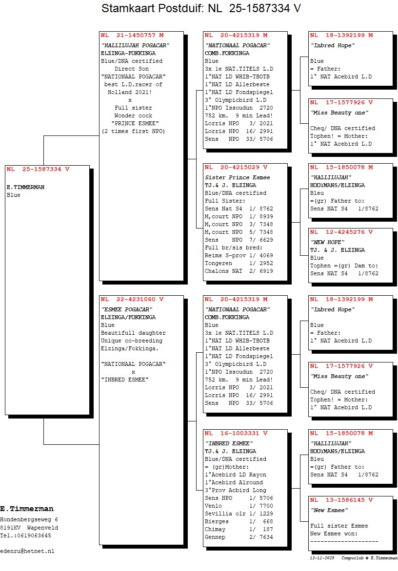 Uit: ”Pogacar Esmee”, zoon ”Nationaal Pogacar”, 3x 1. Nat. Asduif Dagfond, 3. Olympiade duif Cat. Dagfond, dubbele gr-vader 1. Finale OLR PIPR Pattaya 6.101 d. 2025 x ”Esmee Pogacar”, dochter ”Nationaal Pogacar”