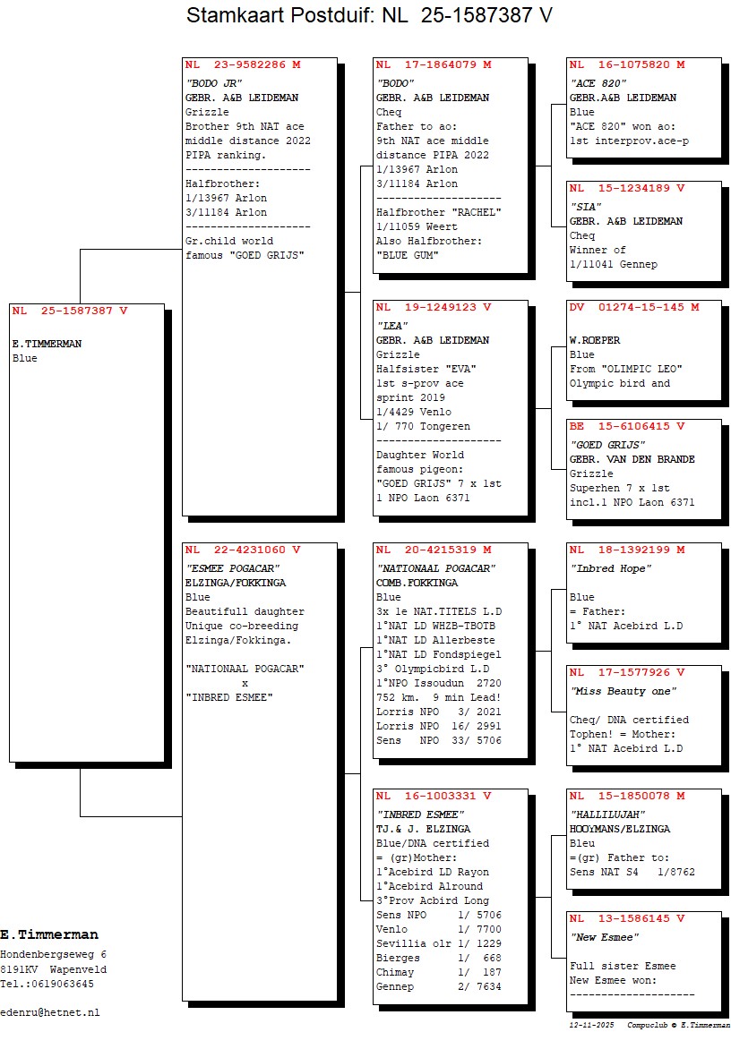 Uit: ”Bodo Jr.”, 1/2 broer 1.-13.967 d., zoon ”Bodo” & ”Lea”, dochter ”Goed Grijs”, 7x 1. Prijs & 1. NPO Laon x ”Esmee Pogacar”, dochter ”Nationaal Pogacar”, 3x 1. Nat. Asduif Dagfond, 3. Olympiade duif Cat. Dagfond