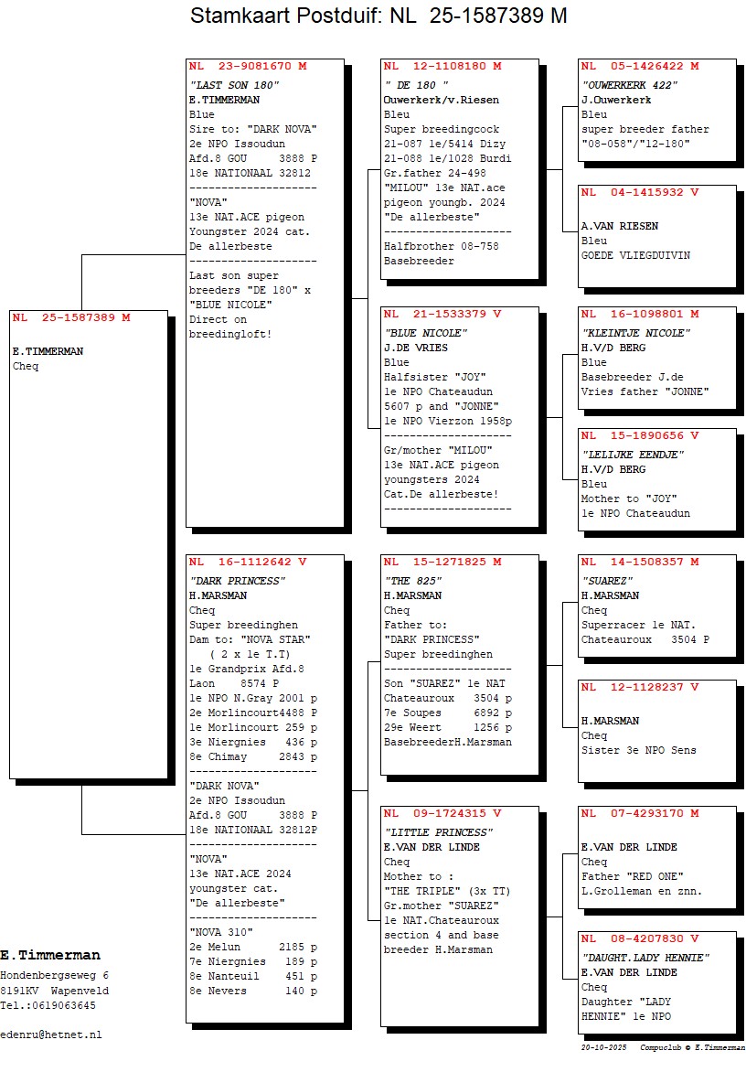 Uit: ”Last Son 180”, vader ”Dark Nova”, 2. NPO Issoudun 3.888 d., vader ”Nova”, 13. Nat. Asduif Jonge Duiven x ”Dark Princess”, moeder ”Nova Star”, 1. NPO Grand Prix Laon 8.574 d., 1. NPO Noord Gray 2.001 d.