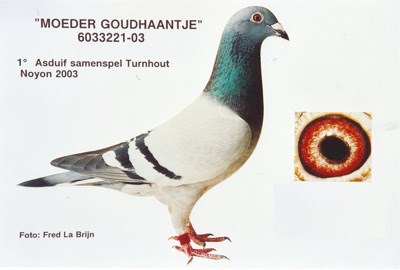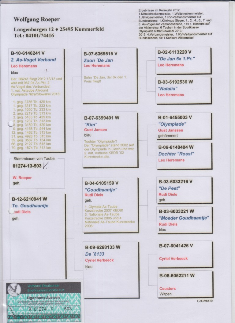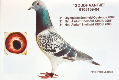 Uit: ”Olympic Leo”, 1. Olympiade duif Cat. Allround, 2. Nat. Asduif Doffers Duitsland, uit uit zoon ”Jan” & dtr. ”Olympiade 003” x ”To. Goudhaantje”, dtr. ”Goudhaantje”, 1. Olympiade duif Cat. Sprint, 3. & 4. Nat. Asduif Sprint