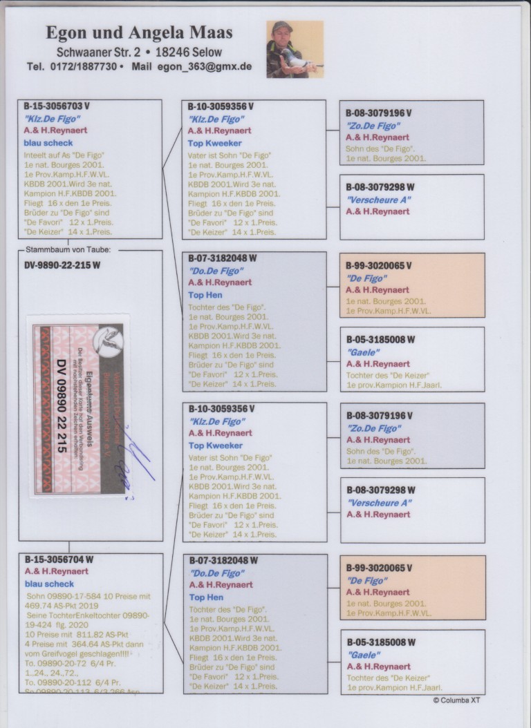 Uit: ”Klz. de Figo”, uit dochter ”De Figo”, 1. Nat. Bourges 2001, 1. Prov. Asduif Grote Halve Fond KBDB, uit klz. ”De Figo”, Reynaert x ”A. & H. Reynaert”, uit dochter ”De Figo”, 1. Nat. Bourges 2001, 1. Prov. Asduif GHF