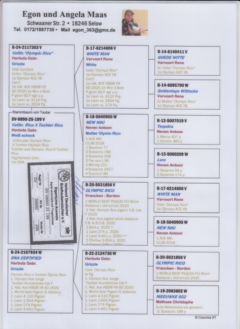 Uit: ”Vollbr. Olympic Rico”, broer ”Olympic Rico”, 1. Int. Asduif Sprint FCI, 1. Nat. Asduif Sprint KBDB, 1. Olympiade duif, zoon ”White Man”, 1. Nat. Asduif Sprint FCI x ”DNA Certified”, dochter ”Olympic Rico”, 1. Olympiade duif