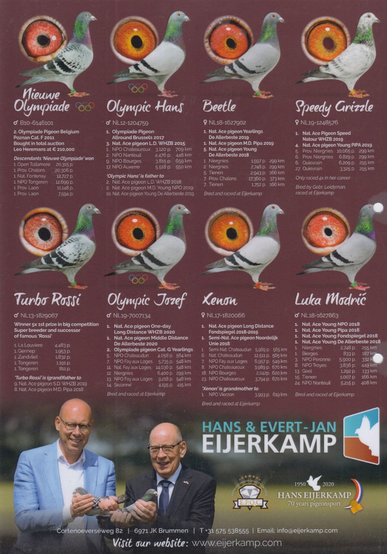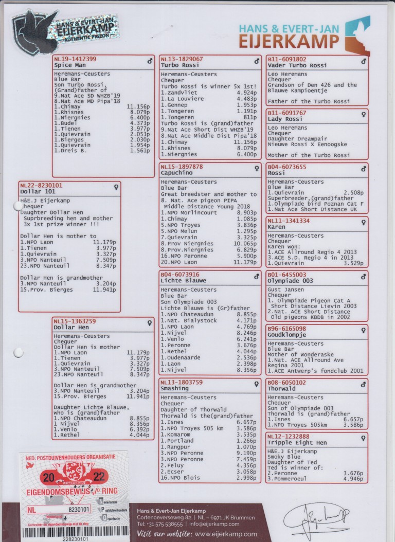 Uit: ”Spice Man”, zoon ”Turbo Rossi”, Uniek kweker (Gr) vader 1.-11.156 d., 1.-8.079 d., 1.-6.400 d., 1.-4.373 d., 1.-3.977 d. x ”Dollar Hen”, Heremans, moeder 1. NPO Laon 11.179 d., 1.-3.977 d., 1.-3.327 d., 3. NPO 7.509 d.