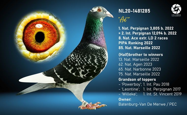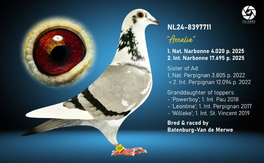 Uit: ”Brother Ad”, broer ”Ad”, 1. Nat. Perpignan 2022, ”Amalia”, 1. Nat. Narbonne 2025, zoon ”Mats” & ”Miss Urk” x ”Dtr. Lloyd Laureaat”, dochter ”Lloyd Laureaat”, 1. Int. Pau 12.631 d. & ”Queen of Narbonne”, 1. Int. Narbon. JL