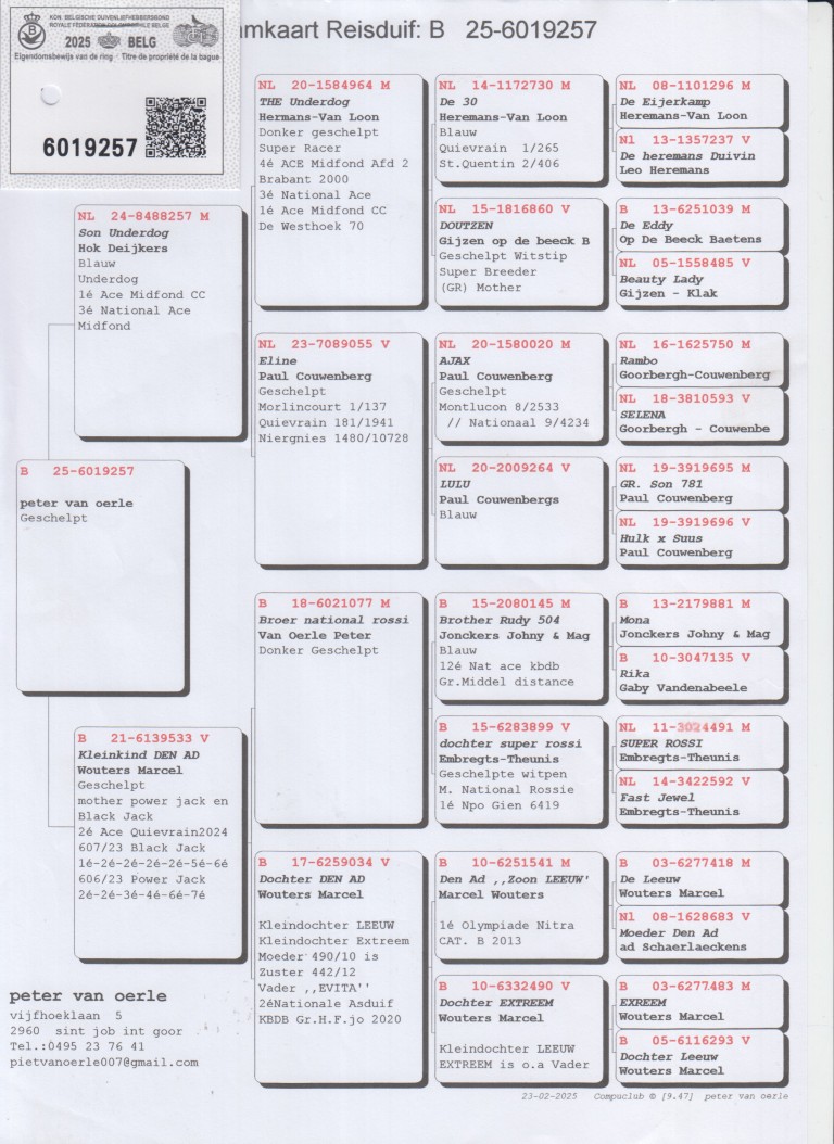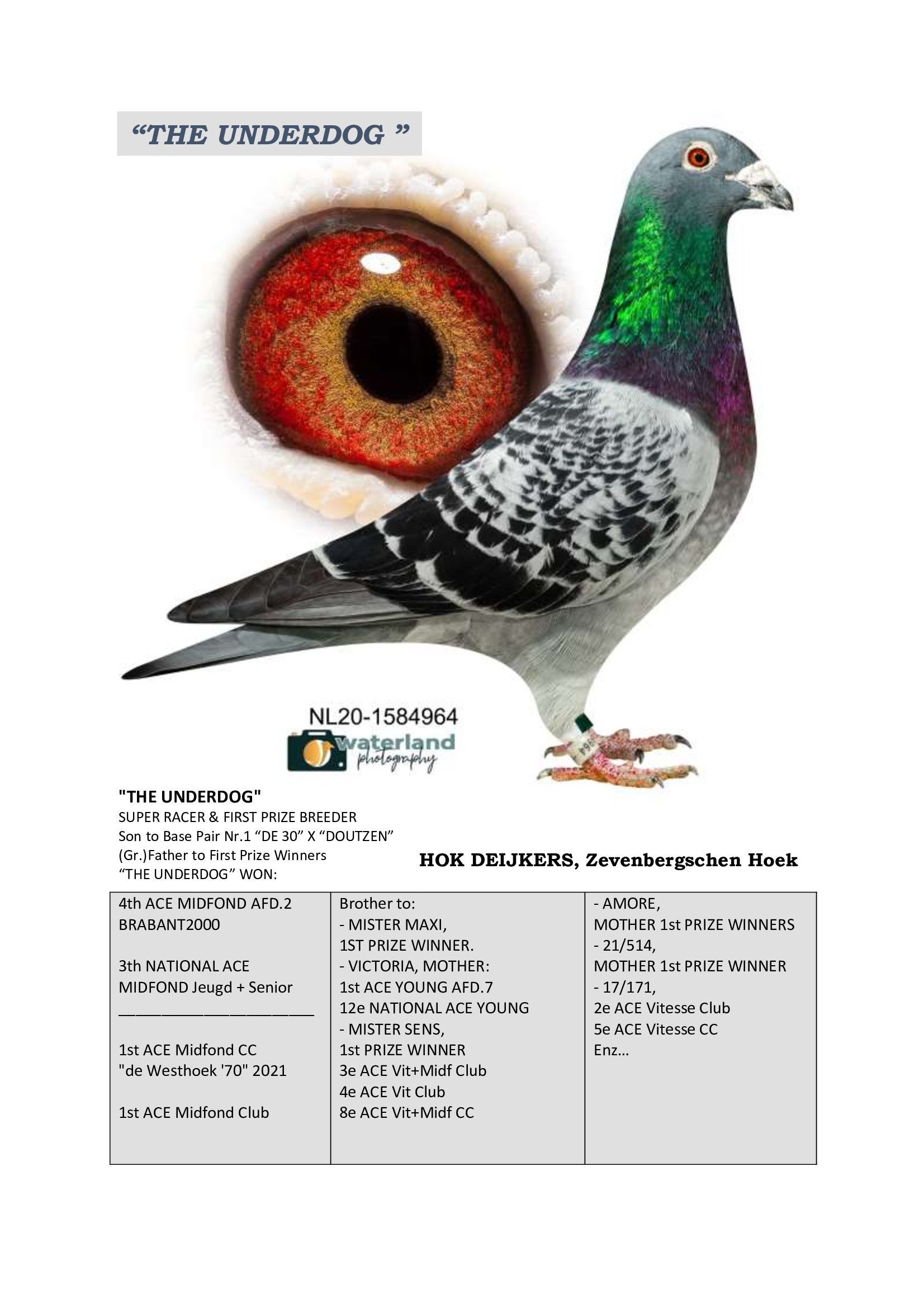 Uit: ”Son Underdog”, zoon ”The Underdog”, 4. Prov. Asduif Midfond x ”Kleinkind Den Ad”, moeder 2. Asduif Quiévrain, 1. Prijs & 6x 2. Prijs, uit dochter ”Den Ad”, 1. Nat. Asduif KBDB, 1. Olympiade duif Cat. Midfond