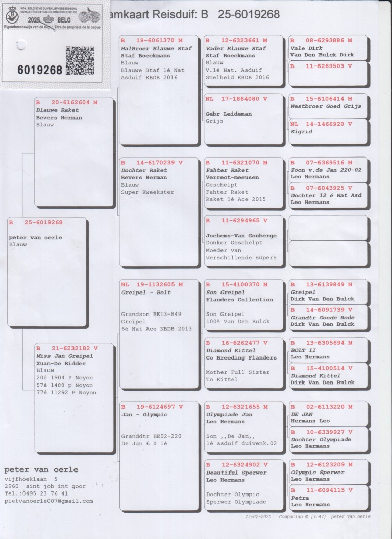 Uit: ”Blauwe Raket”, Herman Bevers, uit 1/2 broer ”Blauwe Staf”, 1. Nat. Asduif KBDB x ”Miss Jan Greipel”, uit kld. ”De Jan”, 1. Nat. Asduif & ”Olympic Sperwer”, Olympiade duif, uit klz. ”Greipel”, 6. Nat. Asduif Sprint KBDB