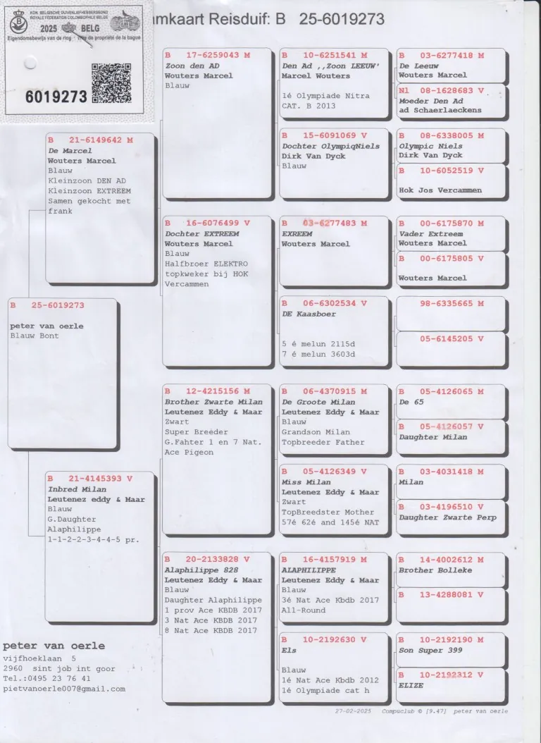 Uit: ”De Marcel”, uit zoon ”Den Ad”, 1. Olympiade duif, 1. Nat. Asduif KBDB, uit dtr. ”Extreem” x ”Inbred Milan”, E. & M. Leutenez, uit dochter ”Alaphilippe”, 3. Nat. Asduif KBDB & ”Els”, 1. Olympiade duif, 1. Nat. Asduif KBDB