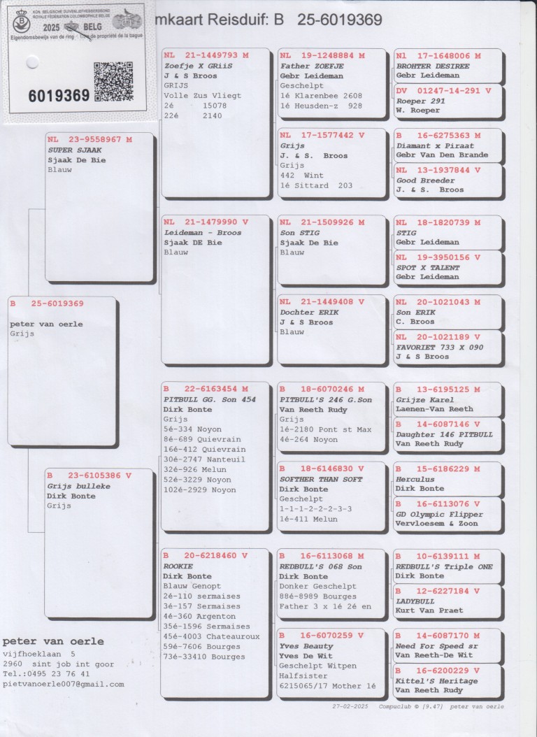 Uit: ”Super Sjaak”, uit broer 2.-15.078 d., lijn ”Diamant” & ”Piraat”, Gebr. v/d Brande x ”Grijs Bulleke”, dochter ”Pitbull GG. Son 454”, 5.-334 d., 8.-689 d., 16.-412 d., 30.-2.747 d., 32.-926 d., inteelt ”Pitbull”, Rudy van Reeth