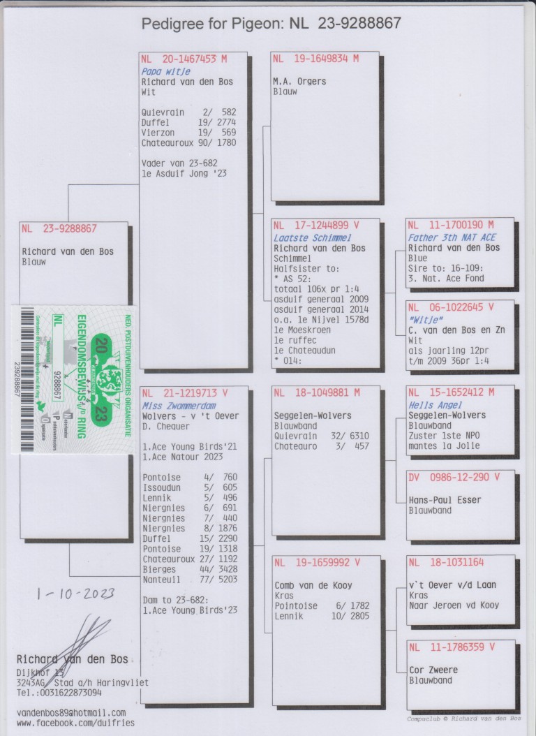 Uit: ”Papa Witje”, 2.-582 d., 19.-2.774 d., vader 1. Asduif Jonge x ”Miss Zwammerdam”, 1. Asduif Jonge Duiven, 1. Asduif Natour, 4.-760 d., 5.-605 d., 5.-496 d., 6.-691 d., 7.-440 d., 8.-1.876 d., moeder 1. Asduif Jonge Duiven