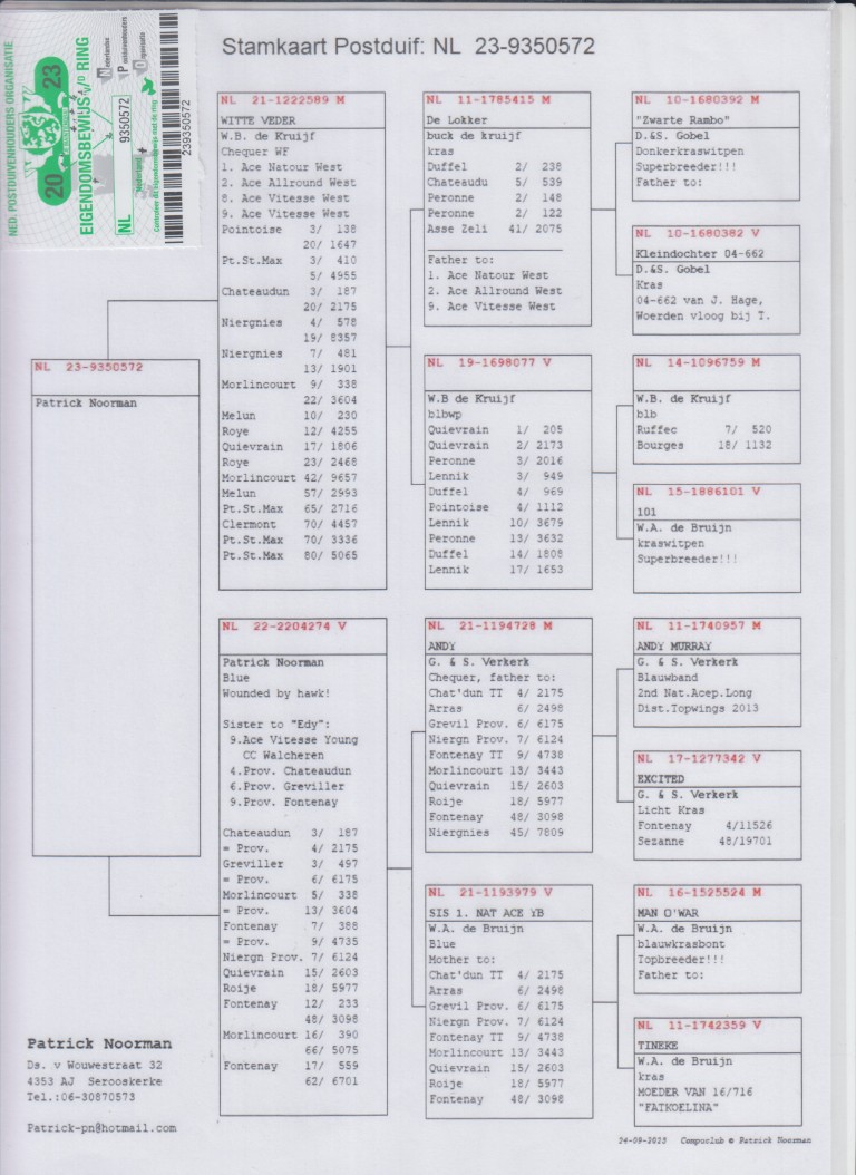 Grootmoeder NL21-1193979. Zus “1. Nat. As-duif YB”. W.A. de Bruijn.