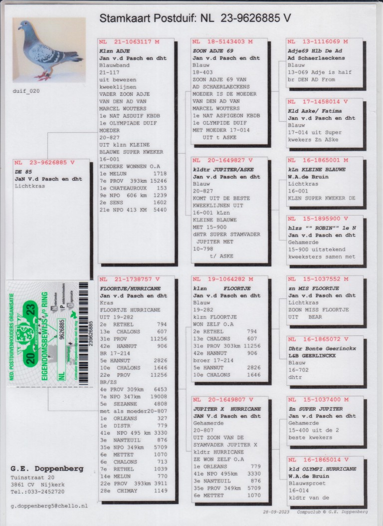 Uit: ”Klz. Adje”, Jan v/d Pasch & dtr., lijn Willem de Bruijn x ”Floortje / Hurricane”, Jan v/d Pasch & dtr., dochter ”Klz. Floortje 282”, 2.-794 d., 13.-607 d., 31. Prov. Chalons 11.256 d., lijn ”Jupiter” & ”Olympic Hurricane”