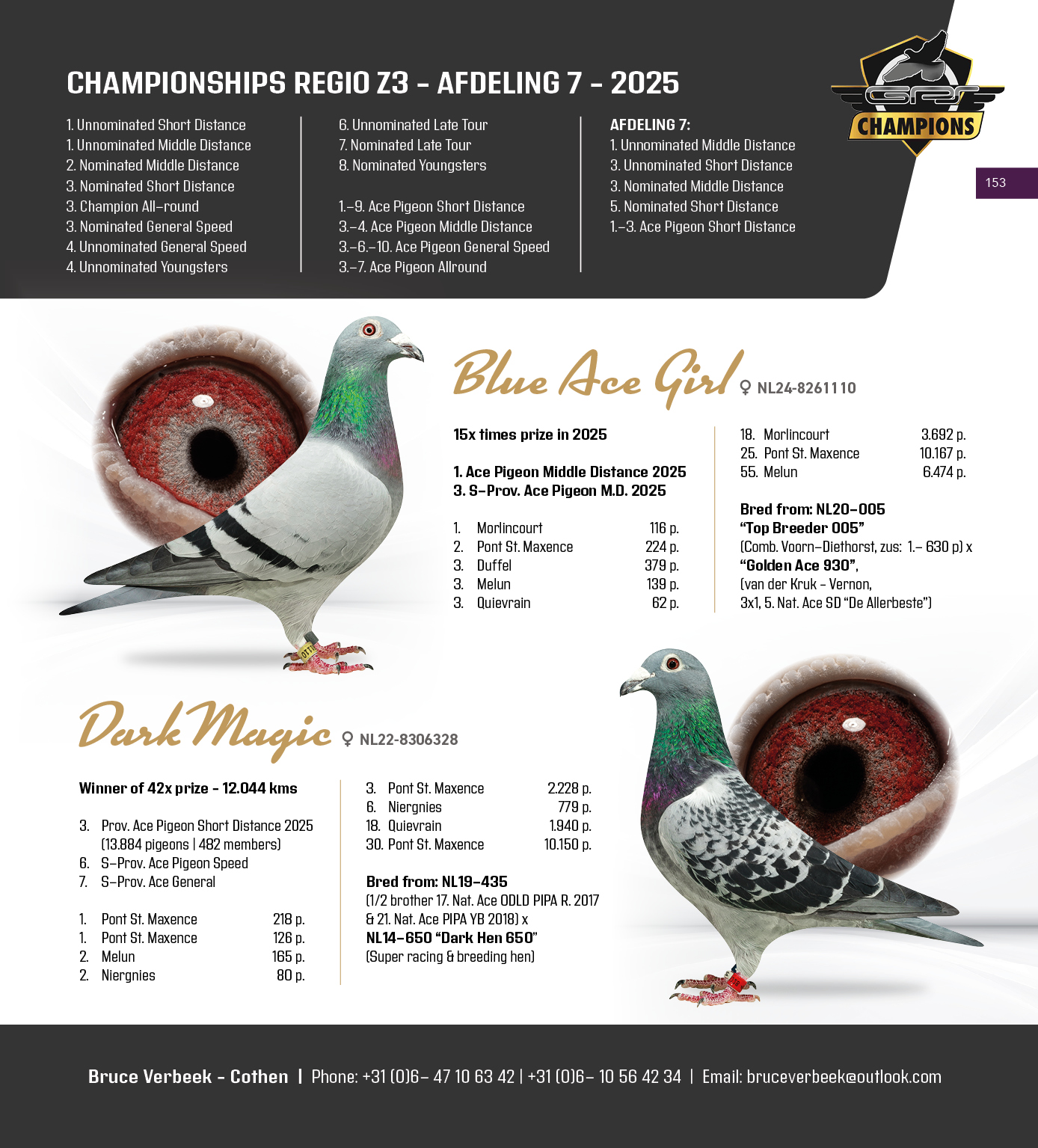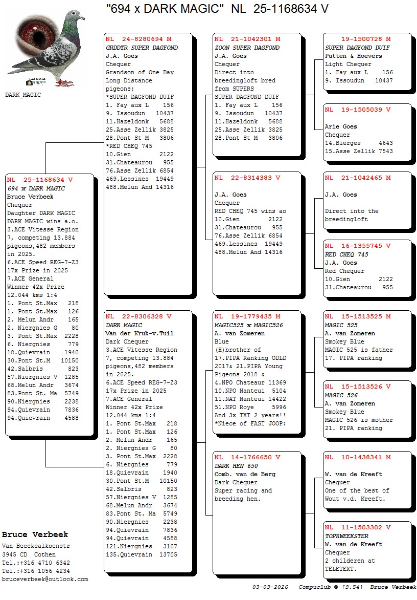 Uit: ”Grdtr. Super Dagfond”, J.A. Goes x ”Dark Magic”, 3. Regionaal Asduif Vitesse, 6. S-Prov. Asduif Vitesse, 7. Asduif Allround, 1.-218 d., 1.-126 d., 2.-80 d., 3.-2.228 d., 6.-779 d., 18.-1.940 d., 30.-10.150 d., 57.-1.285 d.