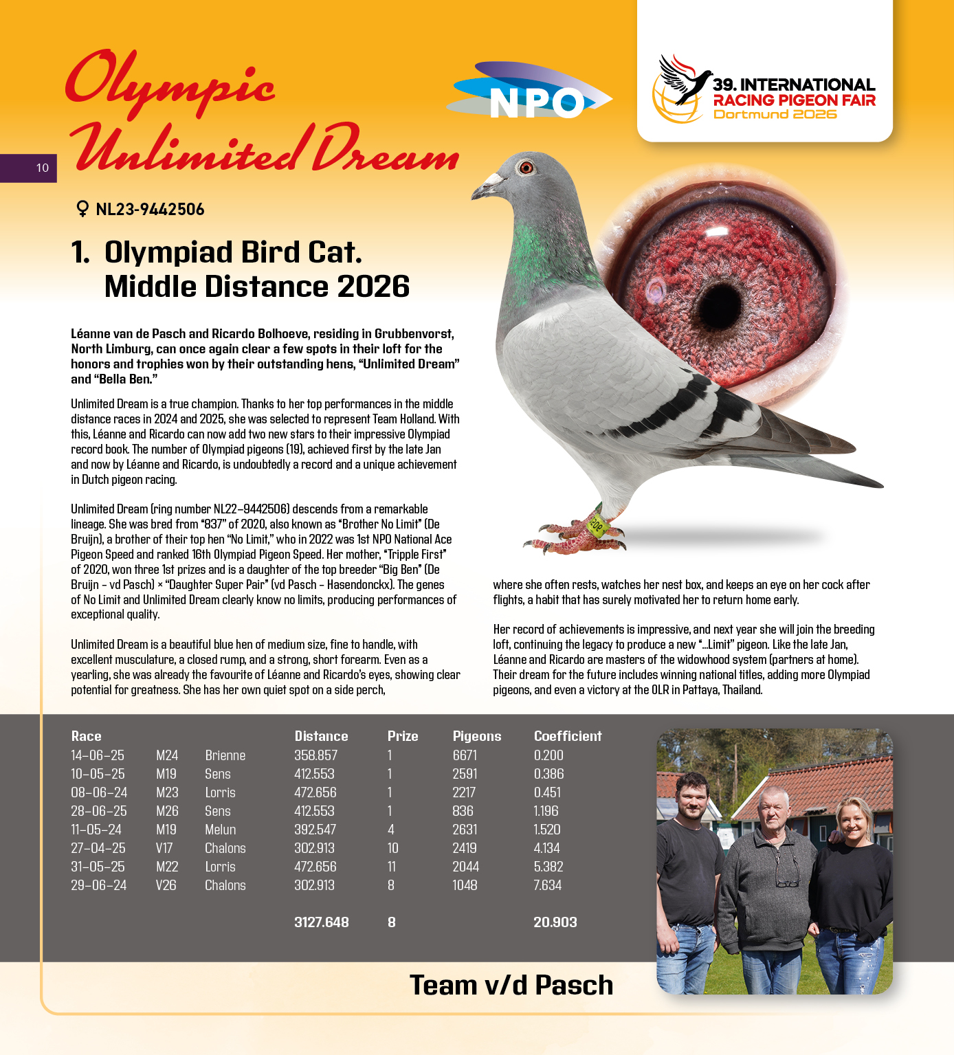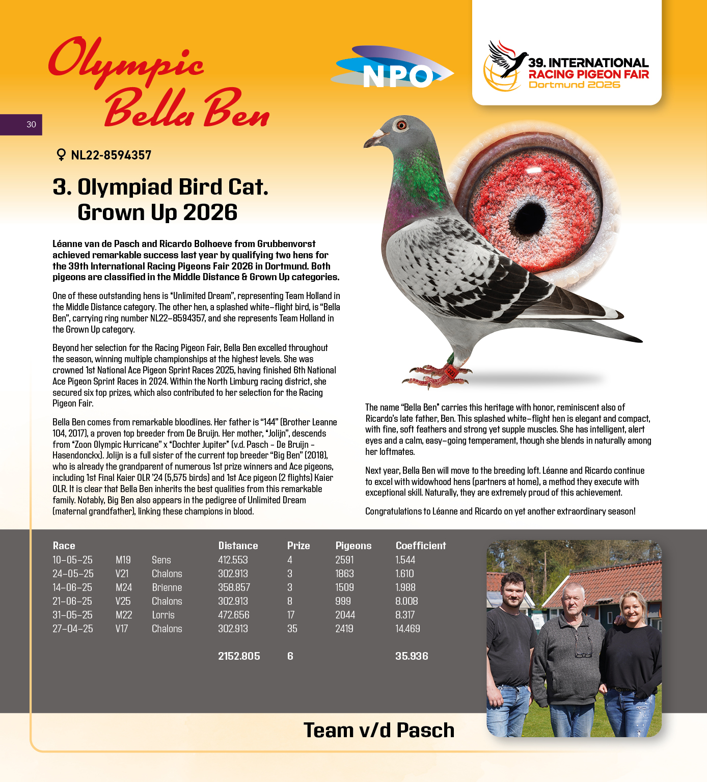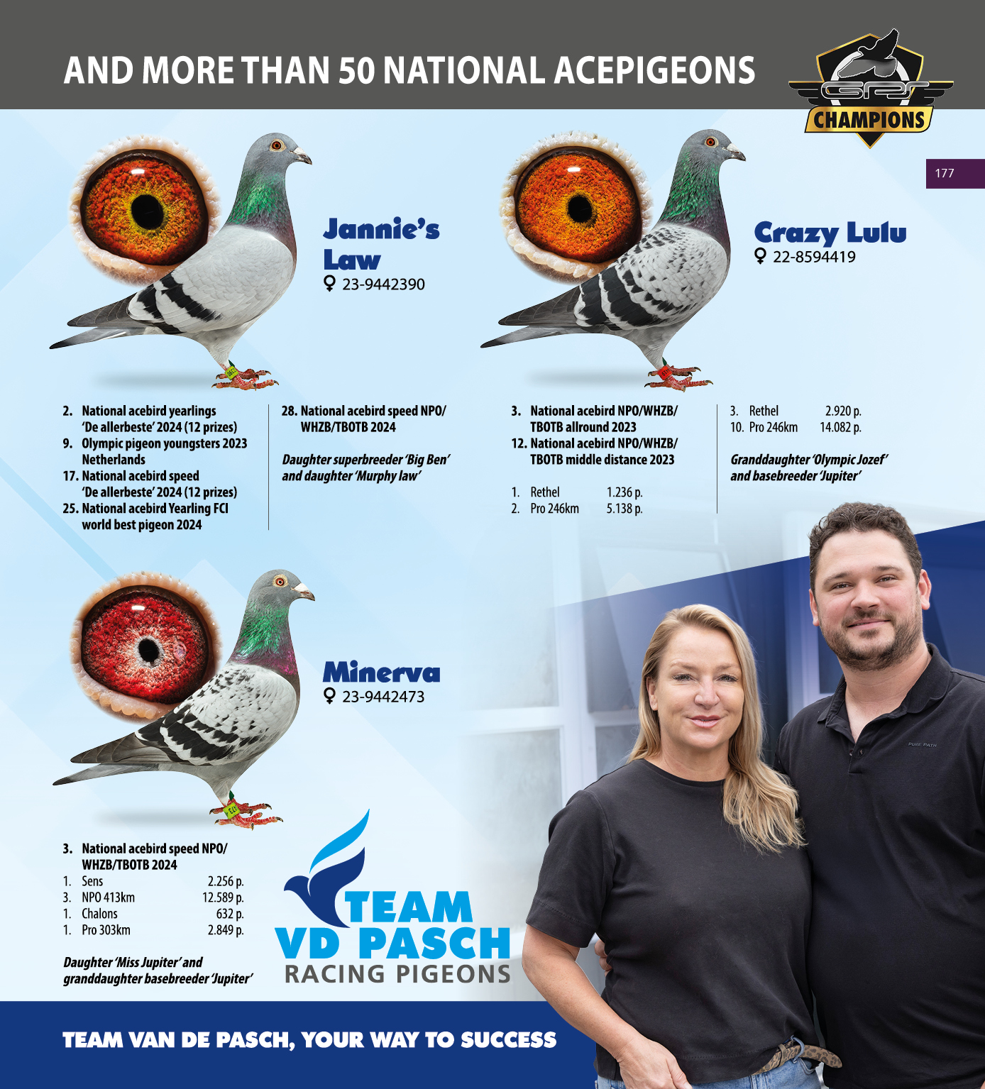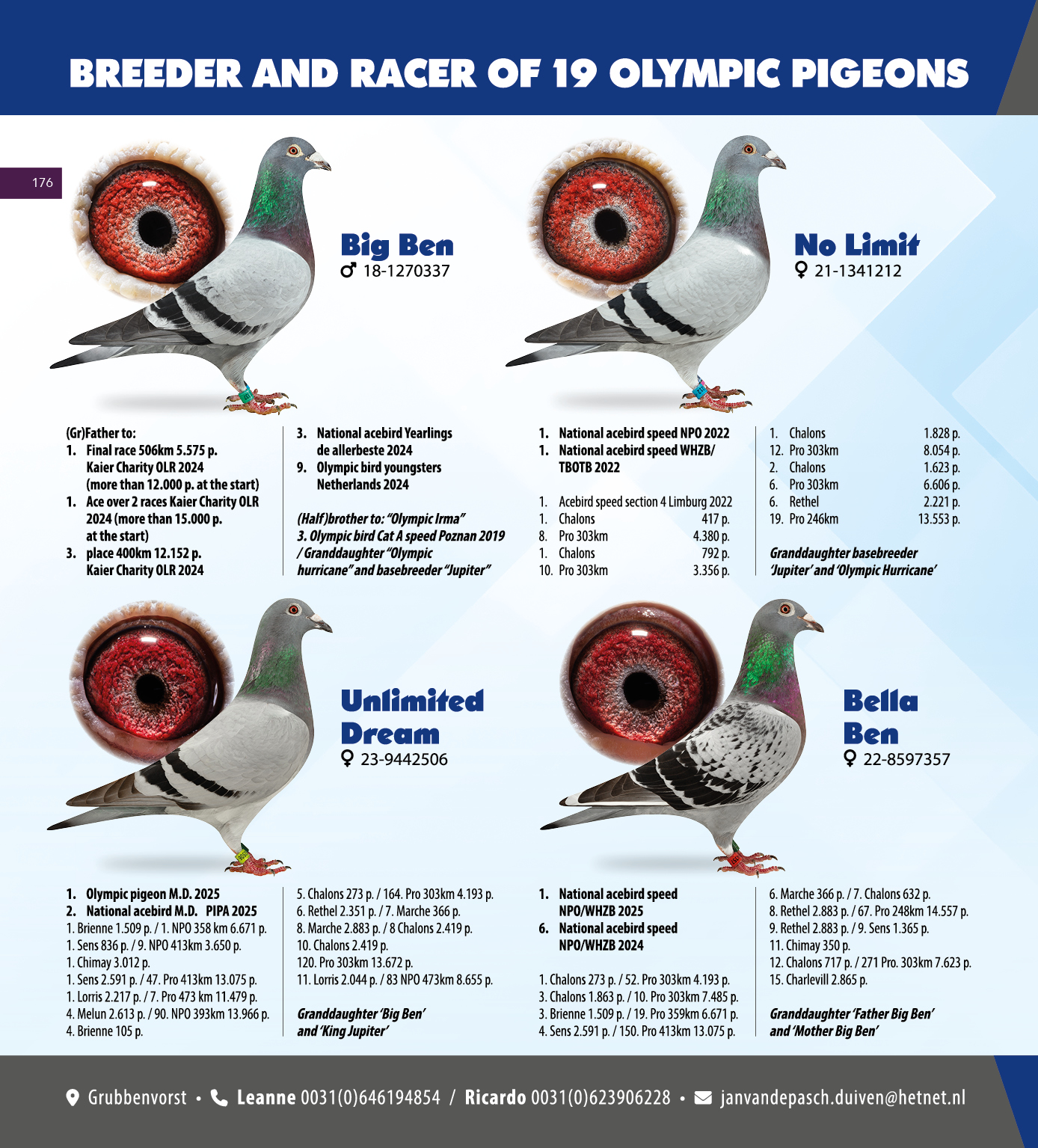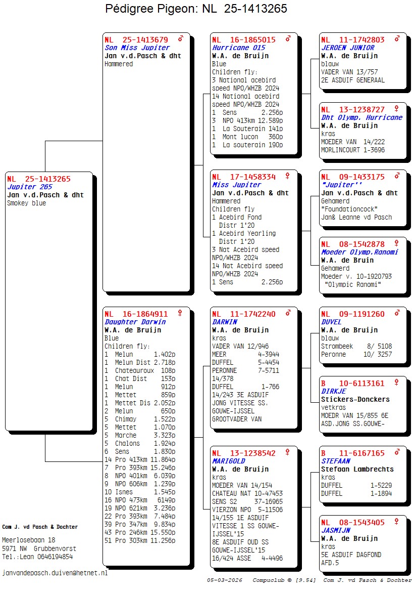 (1/2) zus 1.-2.718 d., 1.-2.052 d., 1.-1.402 d., 1.-912 d., 1.-859 d., 2.-650 d., 5.-3.323 d., 5.-1.924 d., 5.-1.522 d., uit: ”Son Miss Jupiter”, (1/2) broer 1.-2.256 d., 3. & 14. Nat. Asduif Sprint NPO x ”Daughter Darwin”, W.A. de Bruijn