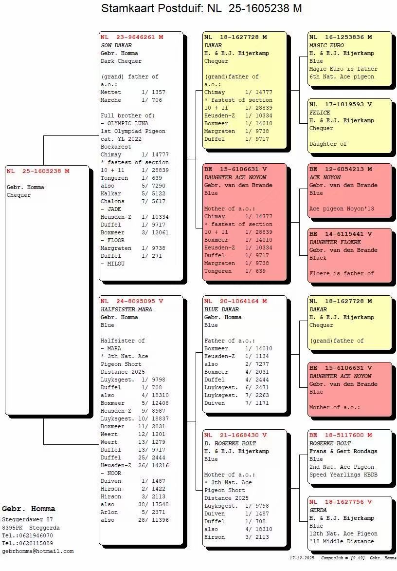 Uit: ”Son Dakar”, (Gr) vader 1.-1.357 d., 1.-706 d., zoon ”Dakar” & ”Dochter Ace Noyon”, ouders 1. Olympiade duif x ”Halfsister Mara”, uit broer ”Olympic Luna”, 1. Olympiade duif, uit zoon ”Dakar” & ”Dochter Ace Noyon”