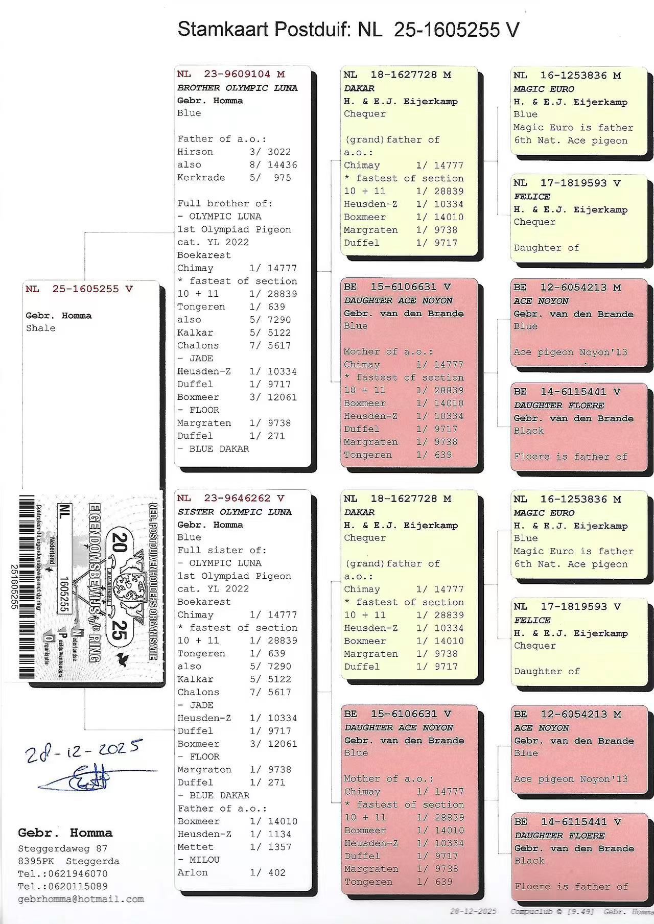 Uit: ”Brother Olympic Luna”, zoon ”Dakar”, (Gr) vader 1. Olympiade duif Jaarlingen, 1.-28.839 d., 1.-14.010 d., 1.-10.334 d., 1.-9.738 d., 1.-9.717 d. x ”Sister Olympic Luna”, dochter ”Dakar” & ”Dochter Ace Noyon”