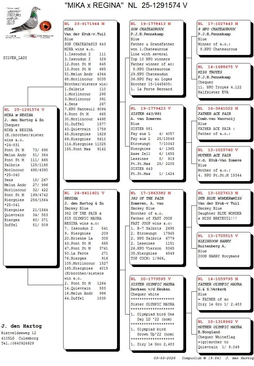 (1/2) zus 18.-267 d., 21.-1.564 d., 27.-996 d., 32.-422 d., 34.-583 d., 51.-364 d., uit: ”Mika”, 1. Issoudun 111 d., 3. Issoudun 329 d., 12.-645 d., 13.665 d. x ”Regina”, 7.-541 d., 9.-209 d., 20.-308 d., 43.-665 d., 47.-3.741 d., 50.-271 d.