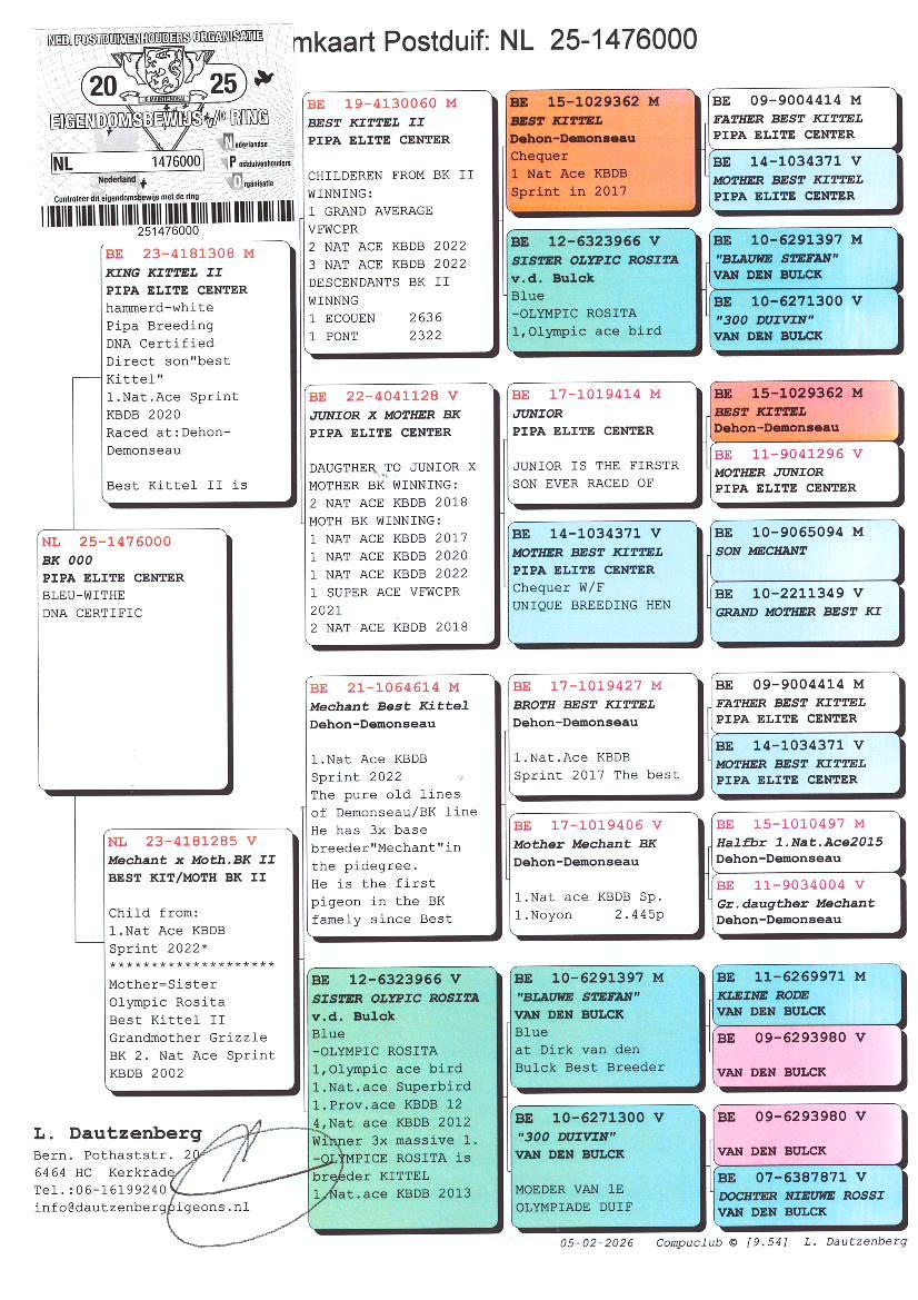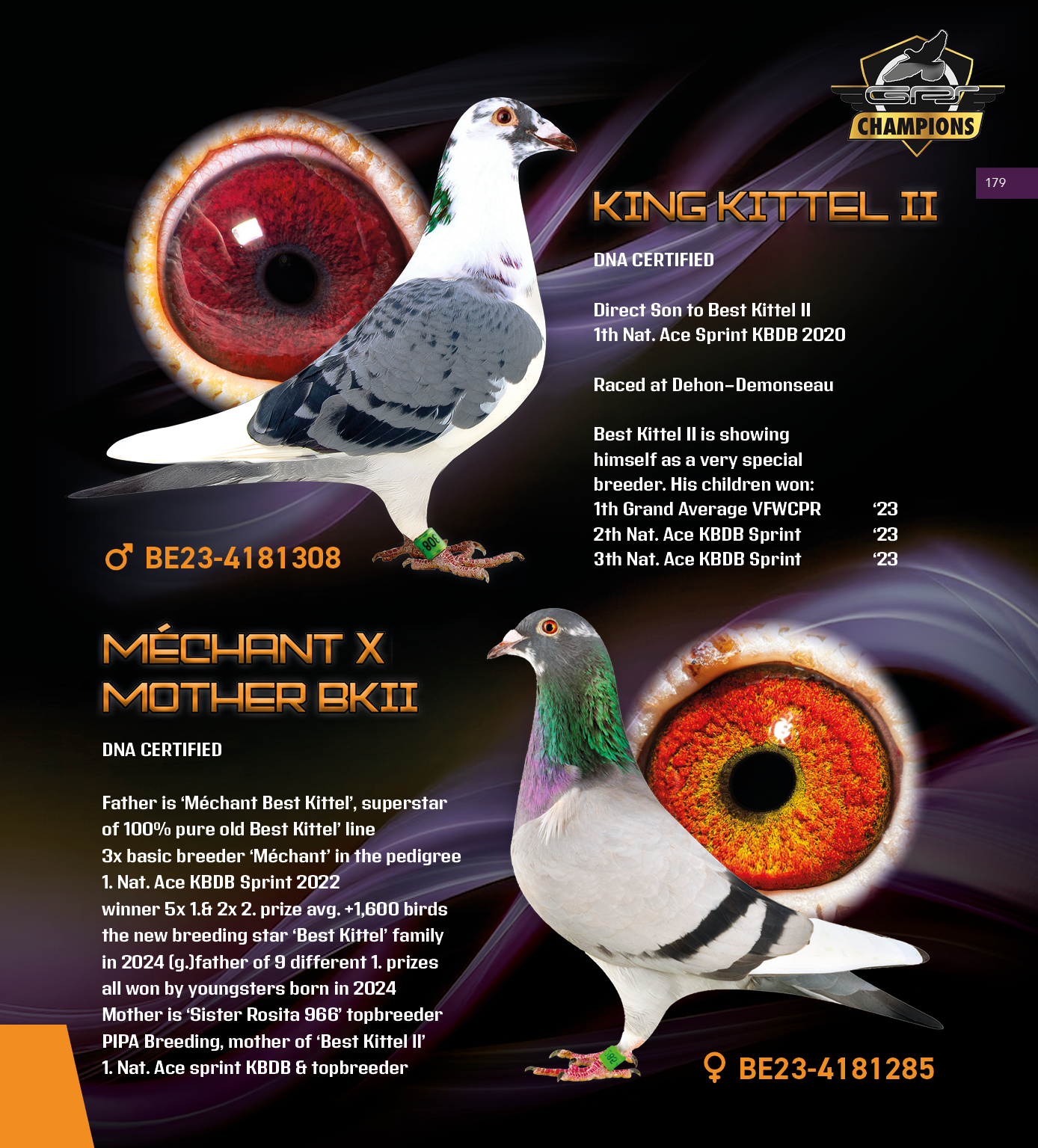 Uit: ”King Kittel II”, 1/2 broer 2. & 3. Nat. Asduif KBDB, zoon ”Best Kittel II”, 1. Nat. Asduif KBDB x ”Méchant x Moth. BK II”, 1/2 zus ”Best Kittel II”, 1. Nat. Asduif KBDB, dochter ”Méchant Best Kittel”, 1. Nat. Asduif Sprint KBDB