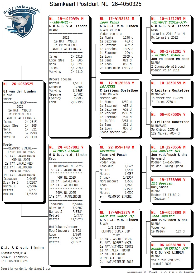 Uit: ”Sam Mace”, 1. Nat. Asduif, 1. Prov. Asduif, 1.-865 d., 1.-821 d., 2.-2.315 d., 2.-1.119 d., 3.-2.290 d. x ”Olympic Simone”, 3. Olympiade duif Cat. JL 2026, 2. Nat. Asduif FCI, 1.-377 d., 3.-2.867 d., 6.-9.464 d., 7.-5.384 d.