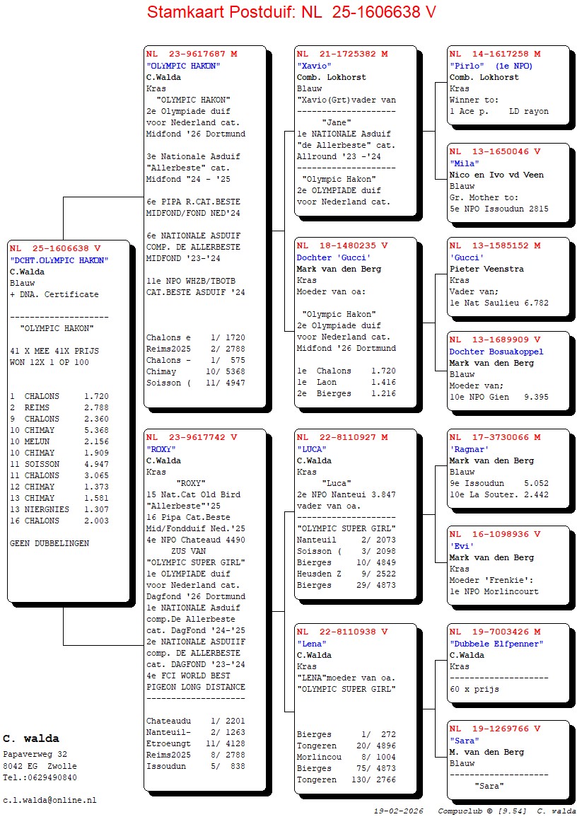 Uit: ”Olympic Hakon”, 2. Olympiade duif Cat. Midfond 2026, 3.-6.-6.-11. Nat. Asduif, 1.-1.720 d., 2.-2.788 d., 9.-2.360 d., 10.-5.368 d., 10.-2.156 d., 10.-1.909 d., 11.-4.947 d. x ”Roxy”, 1.-2.201 d., 2.-1.263 d., 15.-16. Nat. Asduif