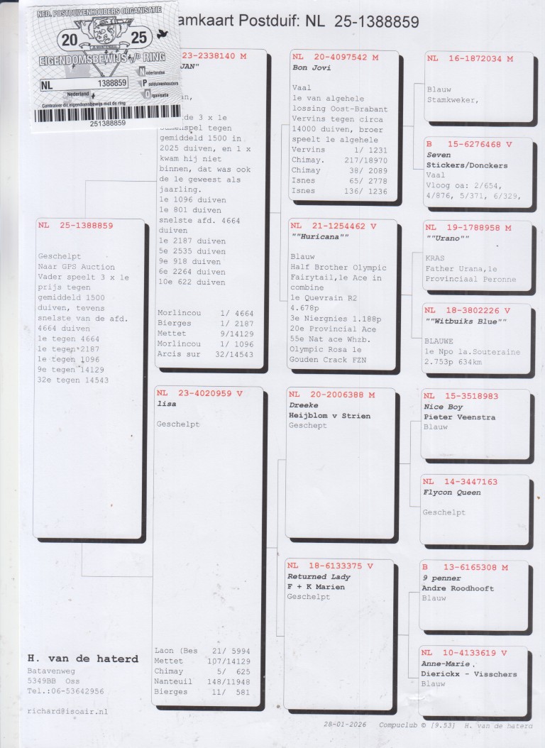 Uit: ”De Jan”, Unieke Topduif, 1. Prov. Morlincourt 4.664 d., 1. Bierges 2.187 d., 1. Morlincourt 1.096 d., 6. Arcis 2.264 d., 9. Prov. Mettet 14.129 d., 9. Laon 918 d. x ”Lisa”, 5. Chimay 625 d., 11. Bierges 581 d., 21. Prov. Laon 5.994 d.