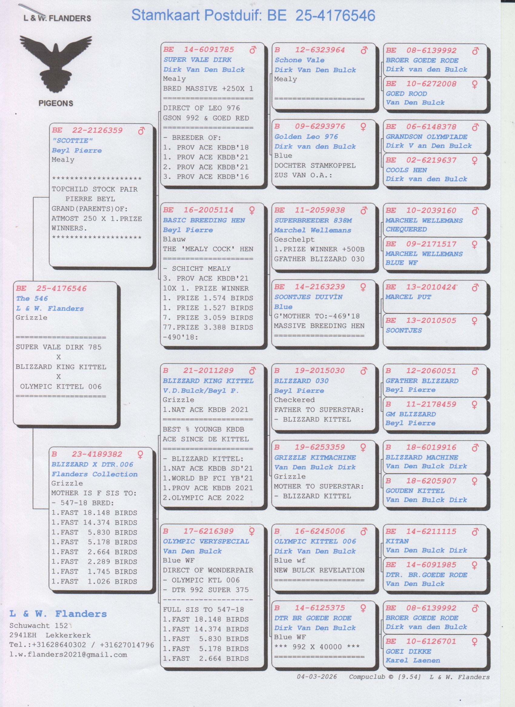 Uit: ”Scottie”, zoon Superkoppel (Gr) ouders 150x 1. Prijs x ”Blizzard x Dtr. 006”, dtr. ”Blizzard King Kittel”, 1. Nat. Asduif KBDB & vader ”Unicum Blizzard”, 1. Nat. Asduif KBDB, uit broer ”Phantom Blizzard”, 1. Nat. Asduif