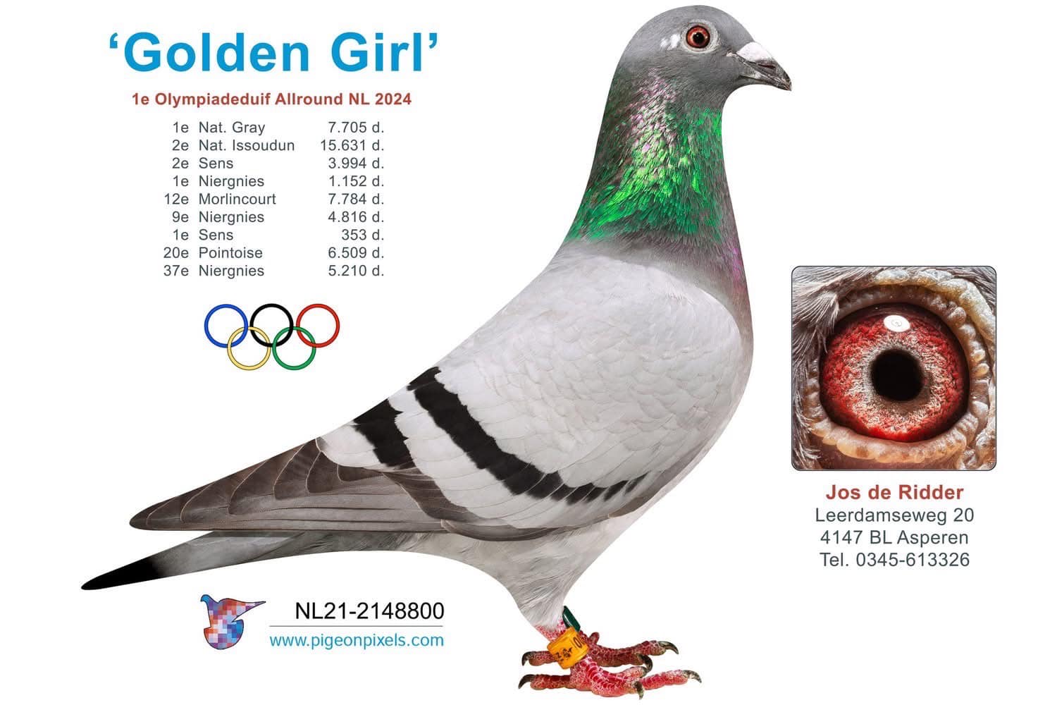 (1/2) broer 1. Olympiade duif Allround ’22-’23, 1. Nat.-9.999 d., 1.- 1.152 d., 2. Nat.- 15.631 d., 2. NPO- 3.994 d., 9.- 4.816 d., 12.- 7.784 d., etc. uit “Den Duitser”, (4x 1) met 7.- 17.612 d., 9.- 13.848 d., 33.- 20.913 d. x “Mother Golden Girl”, superkweekster!