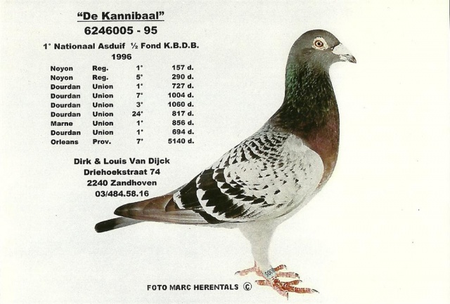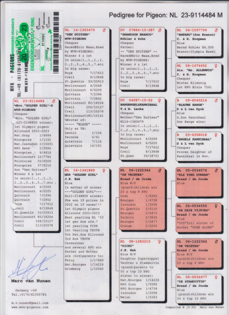 Hij is vader van ‘Den Duitser’ die gekweekt werd door MVN-Pigeons en bij Eric Maas 4 eerste prijzen won.