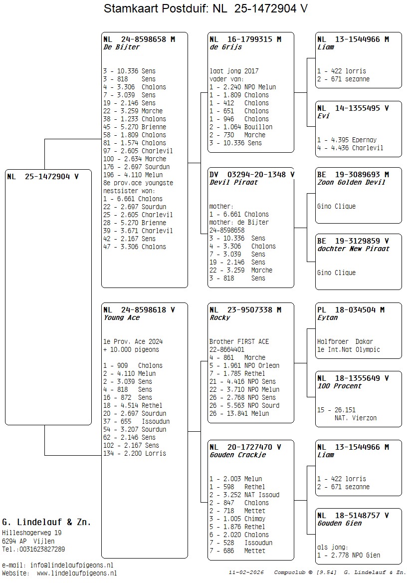 Uit: ”De Bijter”, 3.-10.336 d., 3.-818 d., 4.-3.306 d., 7.-3.039 d., 19.-2.146 d., 22.-3.259 d., 38.-1.233 d., 45.-5.270 d. x ”Young Ace”, 1. Prov. Asduif 10.000 d., 1.-909 d., 2.-4.110 d., 2.-3.039 d., 4.-818 d., 16.-872 d., 18.-4.514 d., 20.-2.697 d.